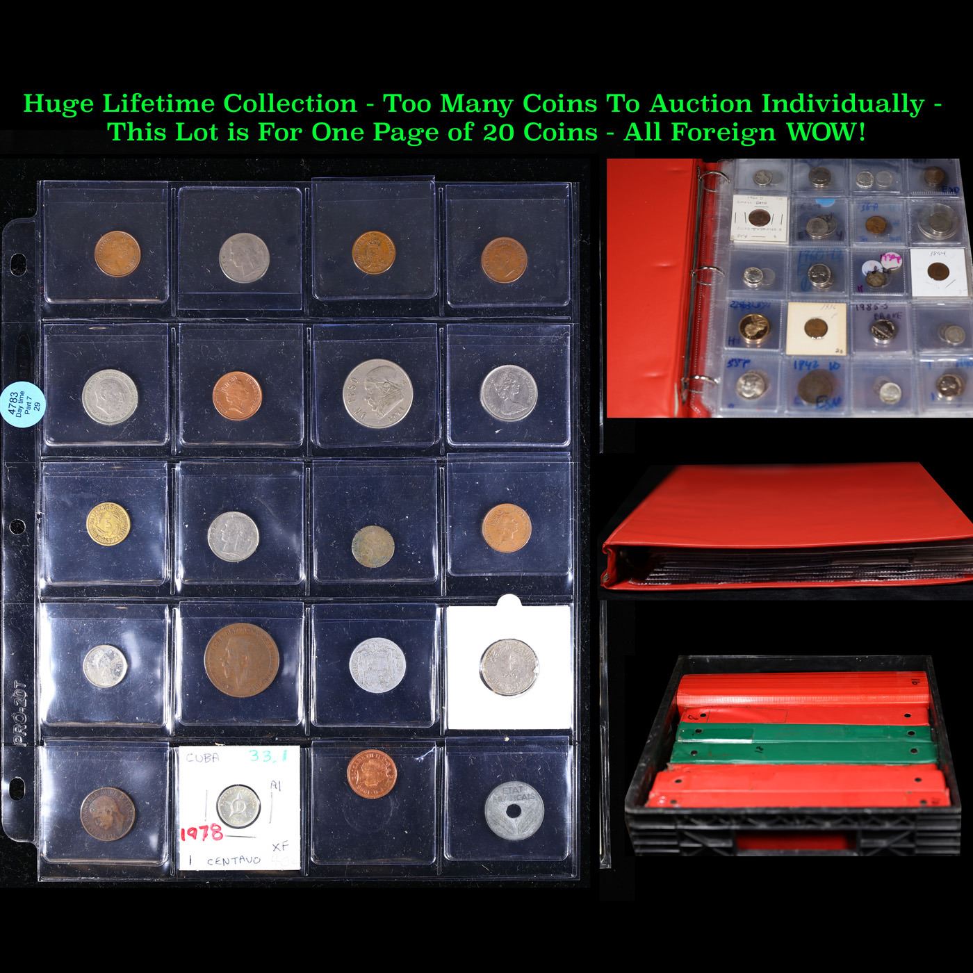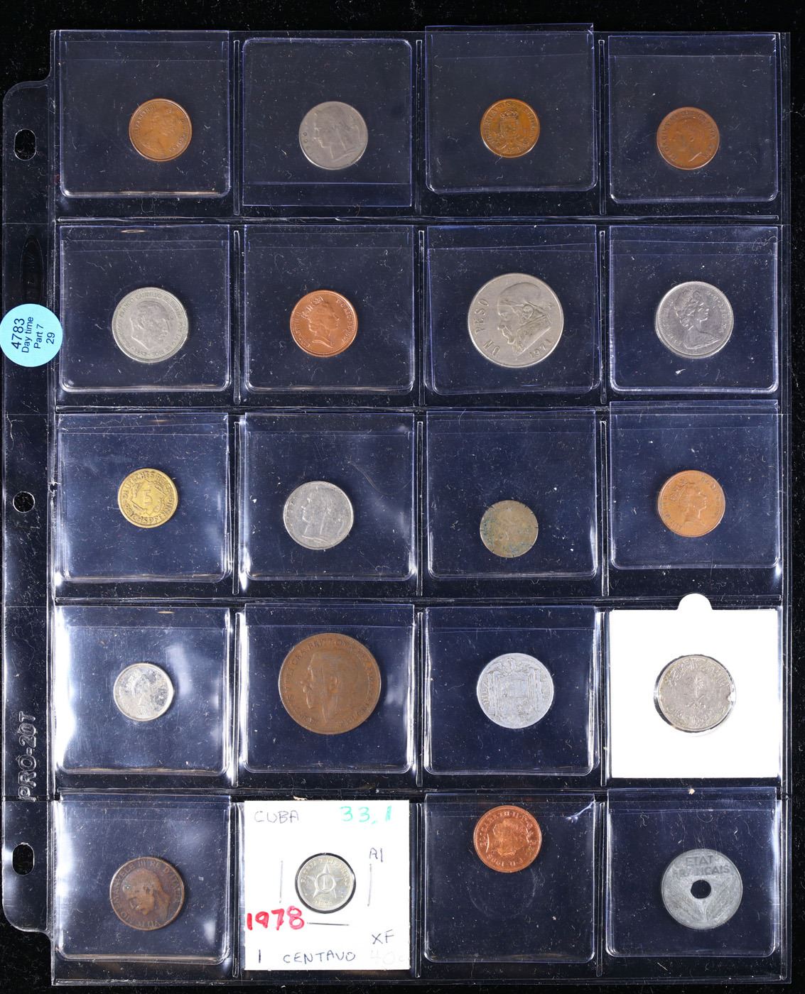 Huge Liifetime Collection - Too Many Coins To Auction Individually - This Lot is For One Page of 20 Foreign Coins. We have received a huge collection of over 10 thousand US coins in flips, 2x2 holders, and 20 coin pages. We are forced, due to limited lots, to sell this collection in pages of 20 coins. All of the pages include Silver Coins. Most contain Indian Cents, Proof Coins, Barber Coinage, Bust Coinage, Lincoln Cents, Flying Eagles, Jefferson Nickels, Roosevelt Dimes, Buffalo Nickels, Eisenhower Dollars, Kennedy Halves, Large Cents including some Draped Bust Large Cents, Mercury Dimes, and Liberty V Nickels. These pages could not be reviewed by anyone in our office due to time constraints. We estimate the value of each page to meet or exceed $200 in value! Good luck and happy hunting.