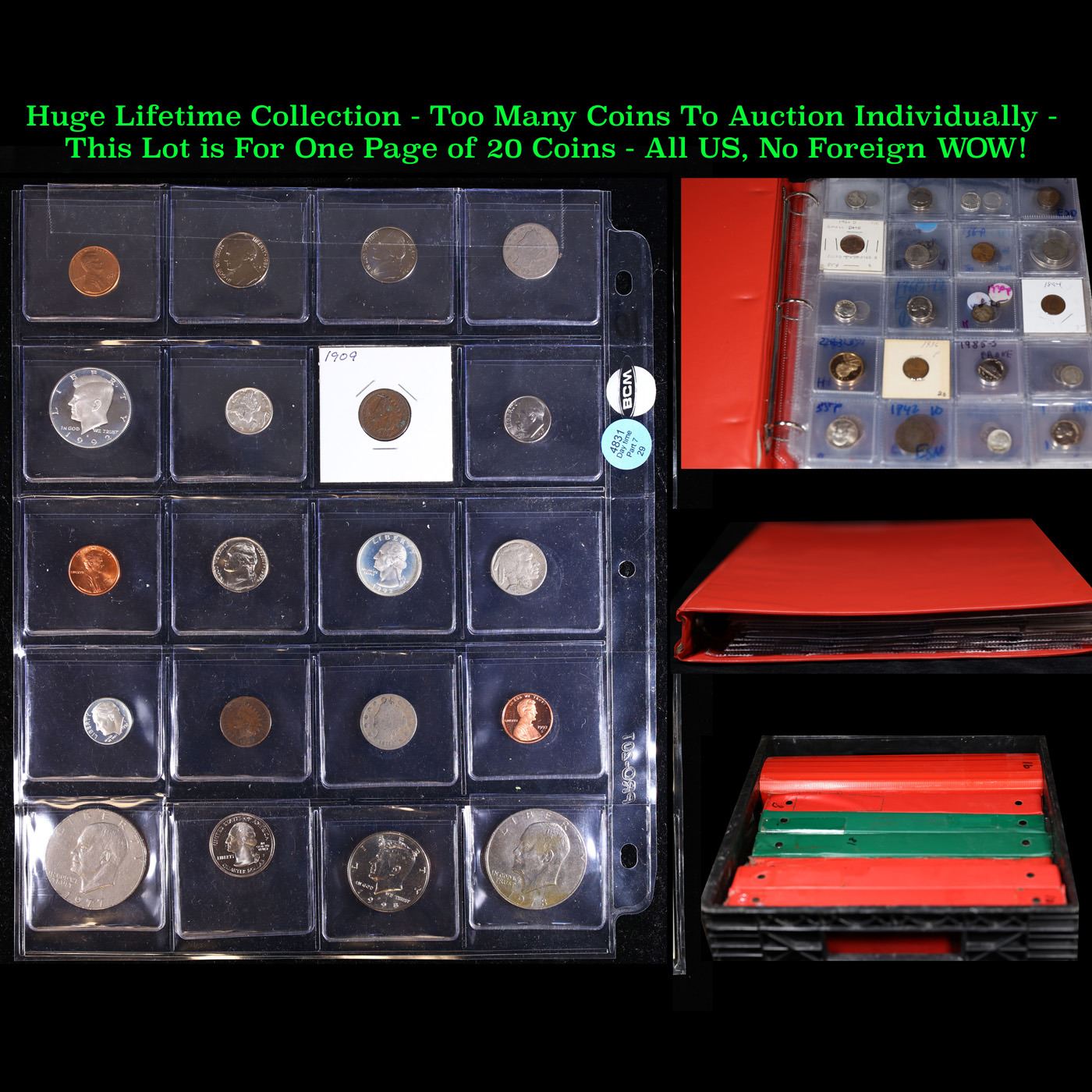 Huge Liifetime Collection - Too Many Coins To Auction Individually - This Lot is For One Page of 20 Coins - All US, No Foreign WOW!. We have received a huge collection of over 10 thousand US coins in flips, 2x2 holders, and 20 coin pages. We are forced, due to limited lots, to sell this collection in pages of 20 coins. All of the pages include Silver Coins. Most contain Indian Cents, Proof Coins, Barber Coinage, Bust Coinage, Lincoln Cents, Flying Eagles, Jefferson Nickels, Roosevelt Dimes, Buffalo Nickels, Eisenhower Dollars, Kennedy Halves, Large Cents including some Draped Bust Large Cents, Mercury Dimes, and Liberty V Nickels. These pages could not be reviewed by anyone in our office due to time constraints. We estimate the value of each page to meet or exceed $200 in value! Good luck and happy hunting.