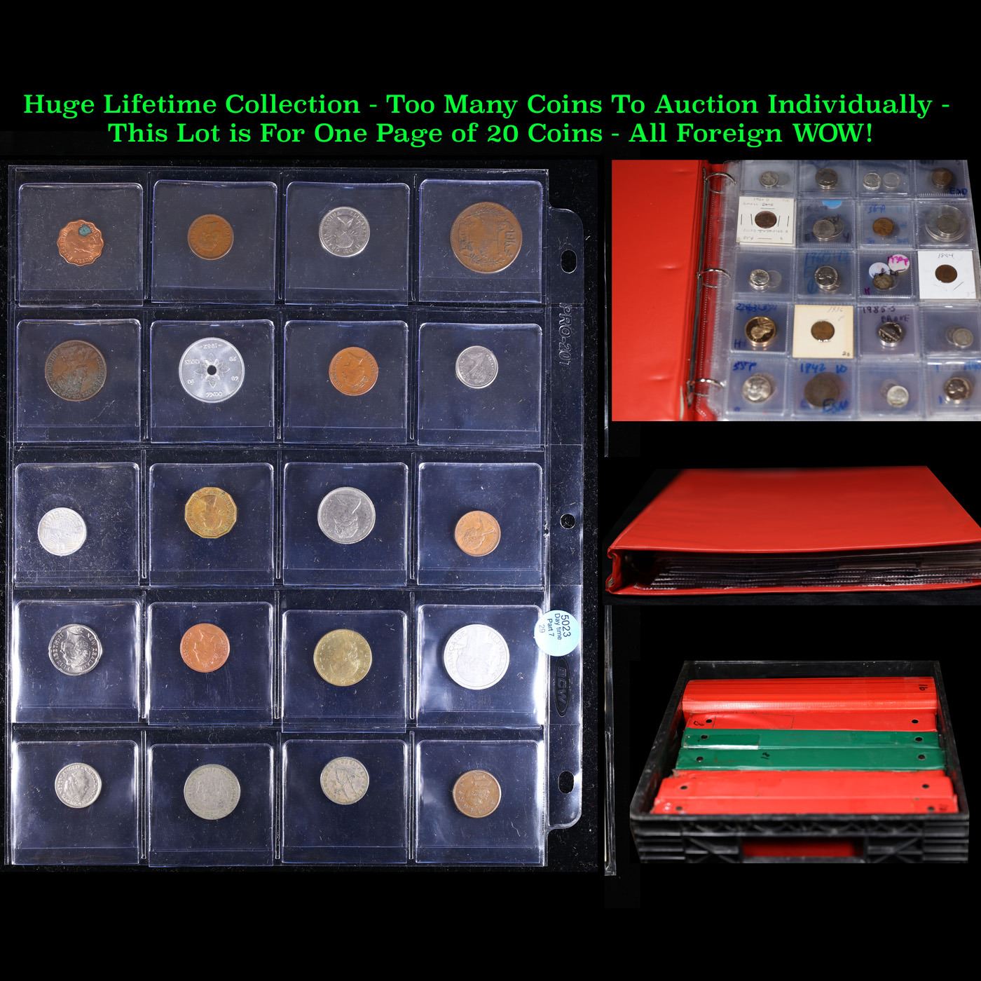 Huge Liifetime Collection - Too Many Coins To Auction Individually - This Lot is For One Page of 20 Foreign Coins. We have received a huge collection of over 10 thousand US coins in flips, 2x2 holders, and 20 coin pages. We are forced, due to limited lots, to sell this collection in pages of 20 coins. All of the pages include Silver Coins. Most contain Indian Cents, Proof Coins, Barber Coinage, Bust Coinage, Lincoln Cents, Flying Eagles, Jefferson Nickels, Roosevelt Dimes, Buffalo Nickels, Eisenhower Dollars, Kennedy Halves, Large Cents including some Draped Bust Large Cents, Mercury Dimes, and Liberty V Nickels. These pages could not be reviewed by anyone in our office due to time constraints. We estimate the value of each page to meet or exceed $200 in value! Good luck and happy hunting.