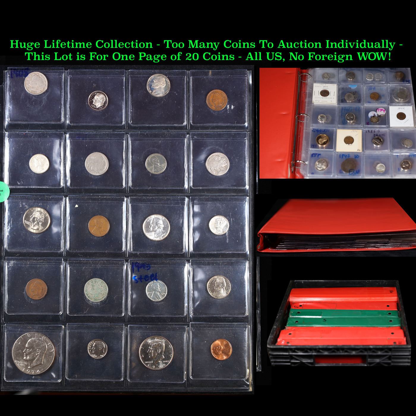 Huge Liifetime Collection - Too Many Coins To Auction Individually - This Lot is For One Page of 20 Coins - All US, No Foreign WOW!. We have received a huge collection of over 10 thousand US coins in flips, 2x2 holders, and 20 coin pages. We are forced, due to limited lots, to sell this collection in pages of 20 coins. All of the pages include Silver Coins. Most contain Indian Cents, Proof Coins, Barber Coinage, Bust Coinage, Lincoln Cents, Flying Eagles, Jefferson Nickels, Roosevelt Dimes, Buffalo Nickels, Eisenhower Dollars, Kennedy Halves, Large Cents including some Draped Bust Large Cents, Mercury Dimes, and Liberty V Nickels. These pages could not be reviewed by anyone in our office due to time constraints. We estimate the value of each page to meet or exceed $200 in value! Good luck and happy hunting.