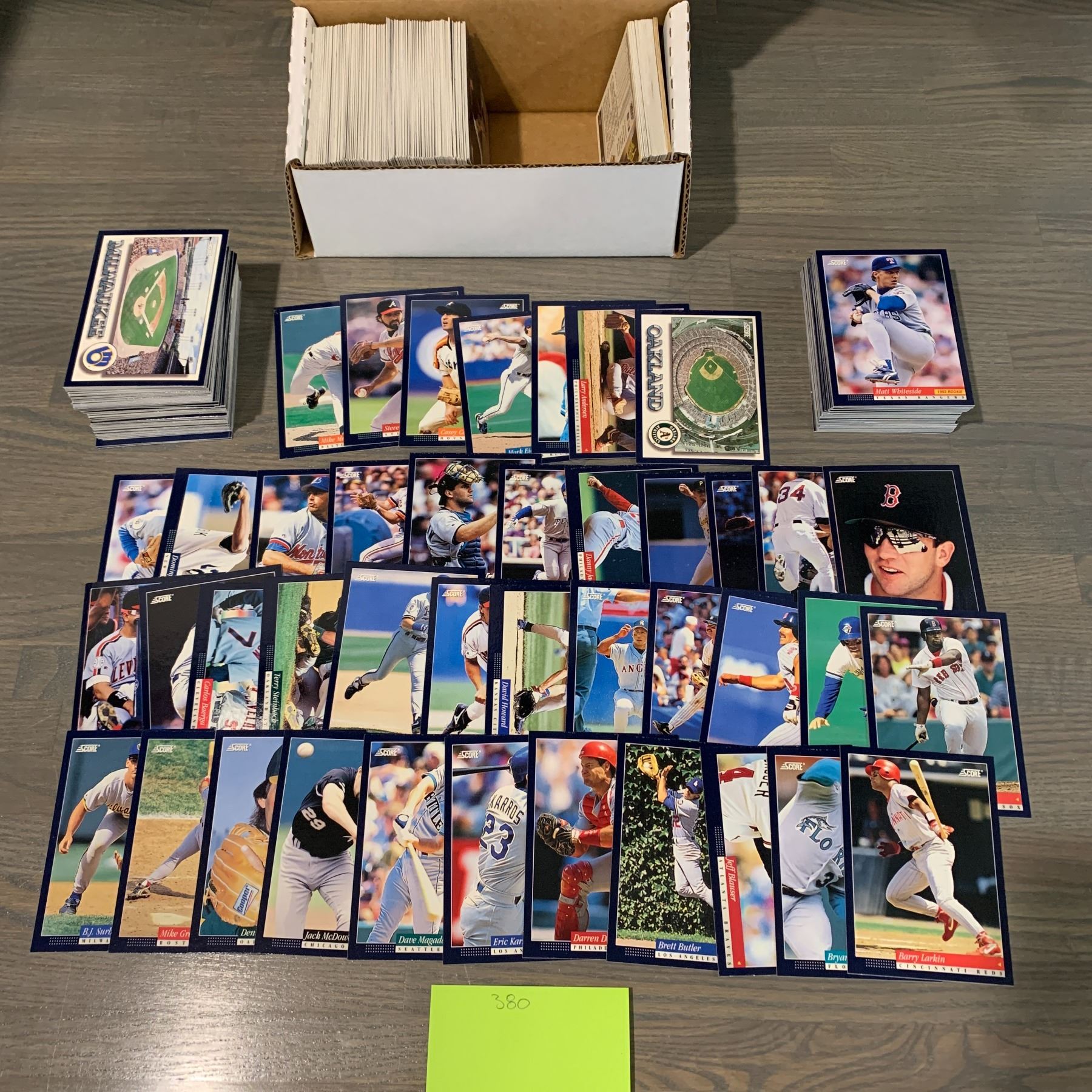 Box filled with 100s of 1990s Score Baseball cards. We are a veteran owned company. Please look at the pictures carefully to determine what you believe the condition of collecitible is. We are currently accepting consignments. Email us a aeronhouse1994@gmail.com or visit our website, www.ahauctionhouse.com. We are currently seeking Star Wars related consignments.