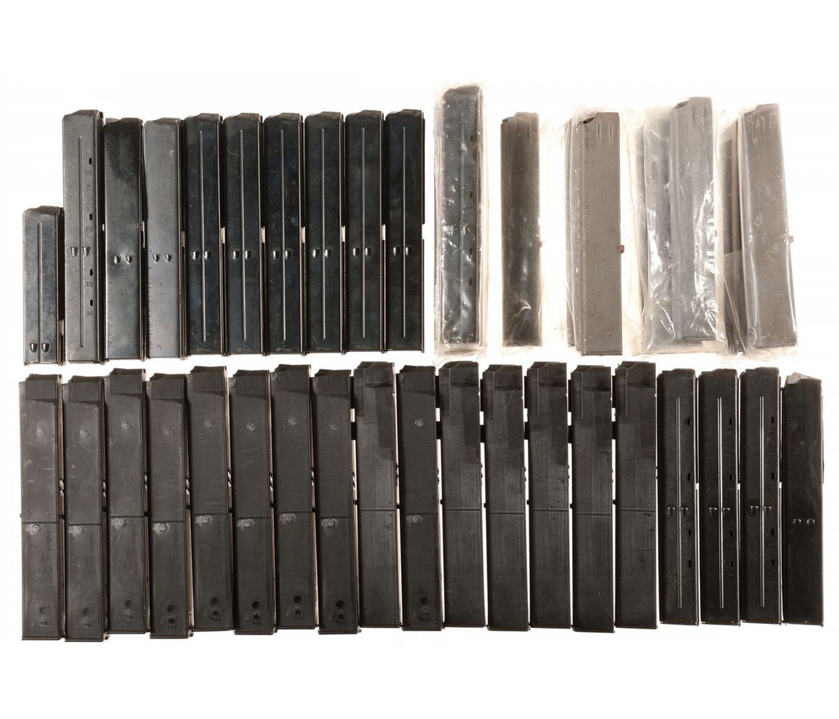 Approximately 49 magazines in a plastic crate. Most are 30-round magazines for the MAC-10. Consists of 10 gray steel magazines, 22 synthetic magazines, 10 blue steel magazines, 1 unknown blue steel magazine and 6 blue steel magazines stamped "MP9mm".