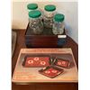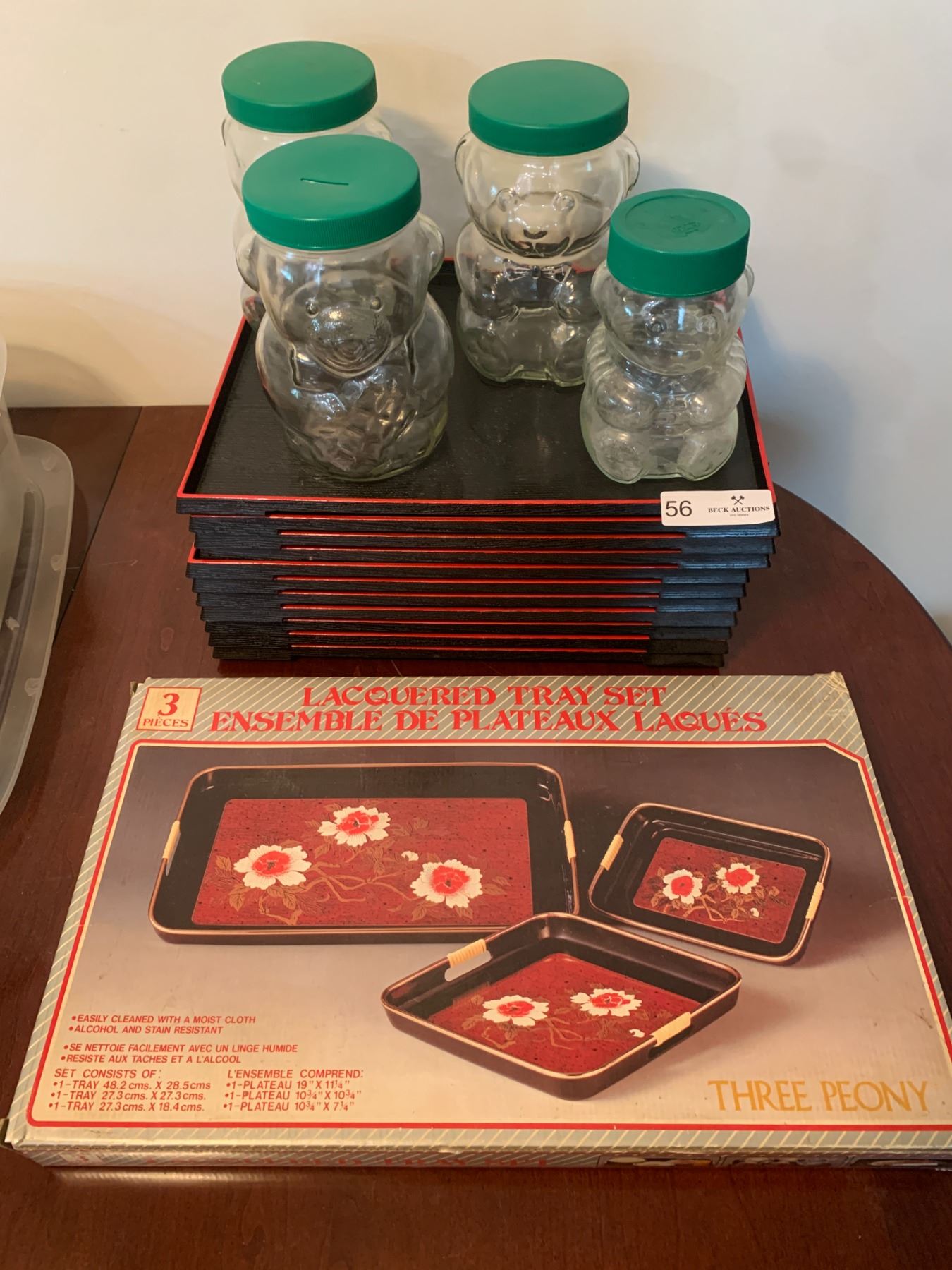 Huge Lot of Serving Trays Glass Peanut Butter Jars Plus a Lacquered Tray Set