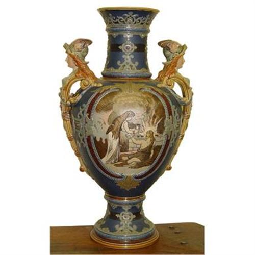 Monumental Mettlach 2 handle vase, rich opulent color with a matching pair of high relief Nordic woman handles complementing the distinct Nordic allegorical center scene adorning both sides of the vase, the underside bearing the proper early maker and artisan marks. Steins, thou nice are common this piece would make an exceptional addition to any fine household or collection. Size: 9.25" w x 17" h.