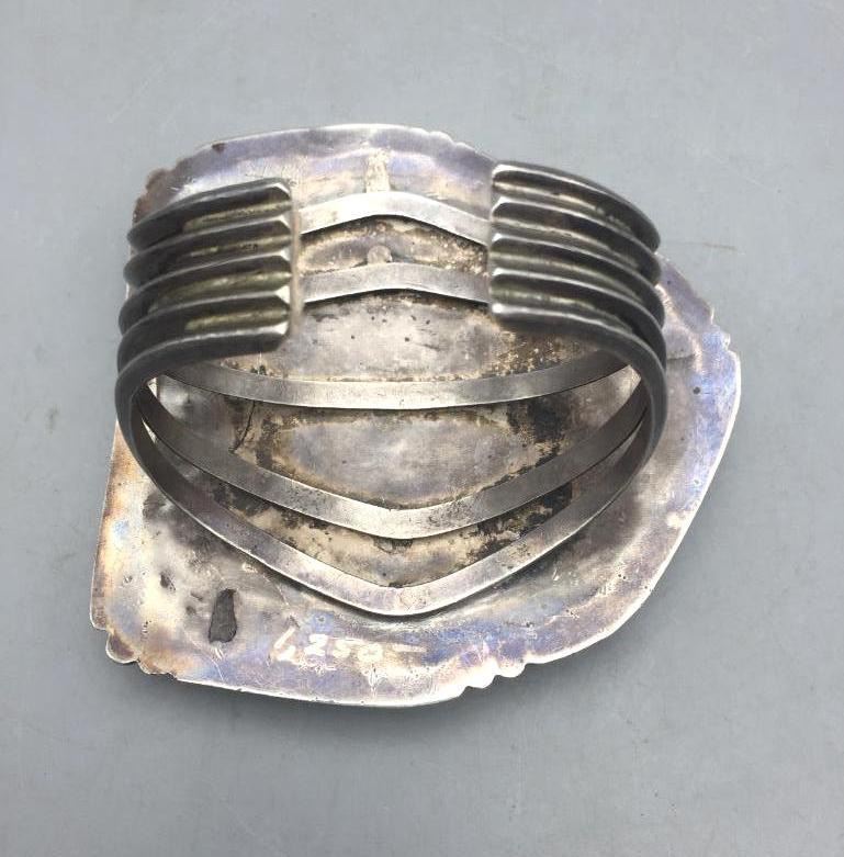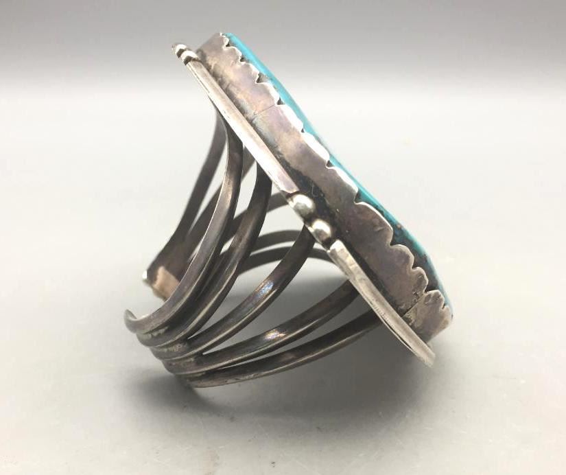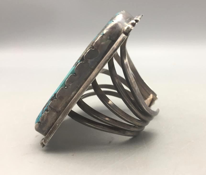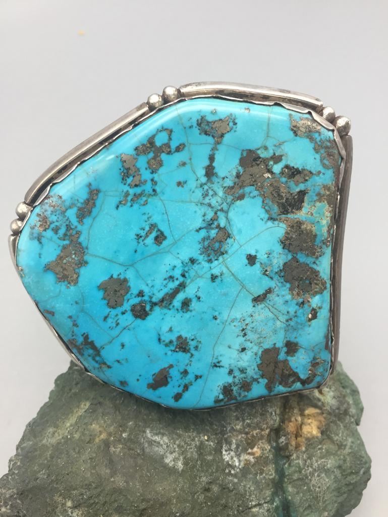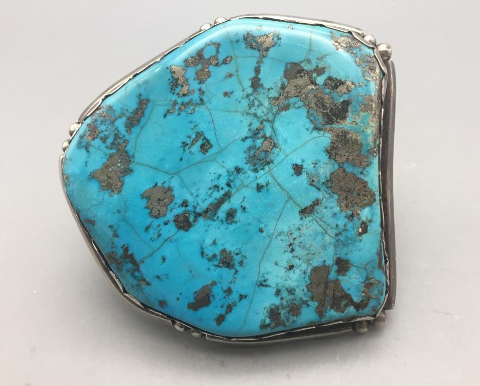 Offered for sale in this lot is this huge, vintage, Morenci turquoise bracelet surrounded by sterling silver accents. Take a look at that wonderful, large stone with flecks of pyrite throughout! Maker: Unmarked. Approx. Age: Vintage. Size: Measures 6-1/4" with a 7/8" opening, fits a 7-1/8" wrist. It is 3-5/8" wide and weighs 246.8 grams. Condition: Good for its age, normal wear expected. Please look closely at the pictures - they are an important part of our description. Shipping: There will be a $5 handling, packaging fee for shipping this lot. The actual cost of postage will be added on top of that.