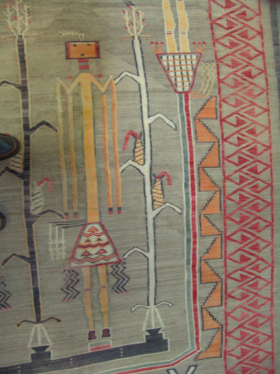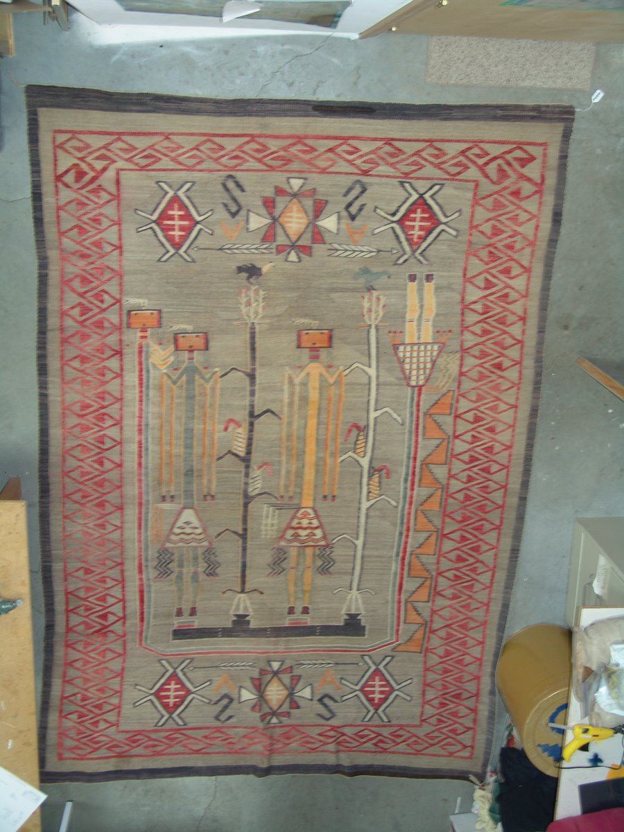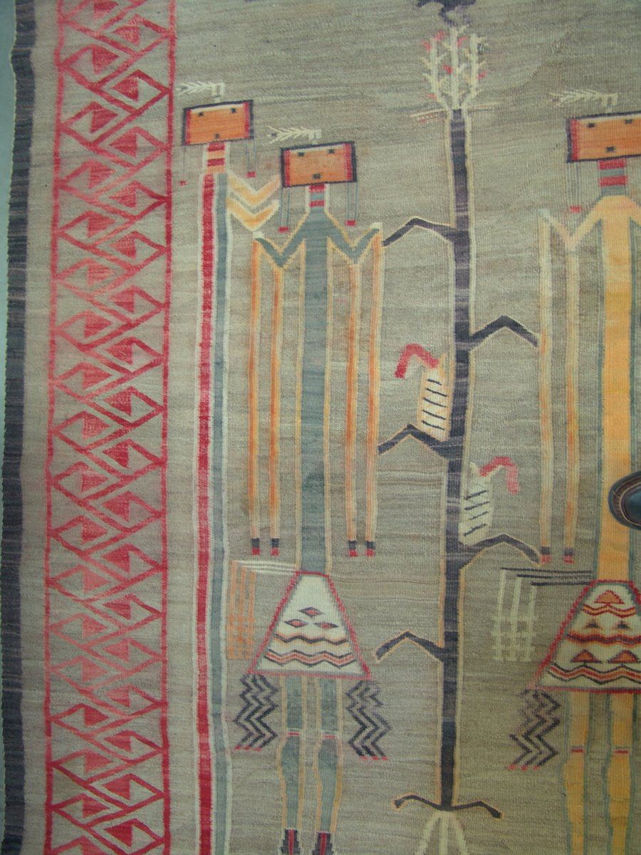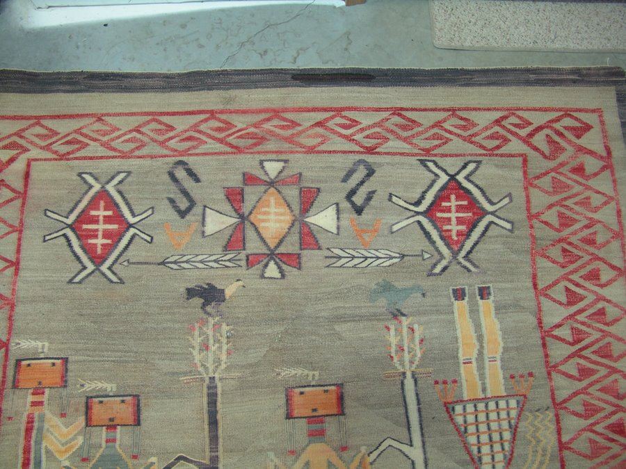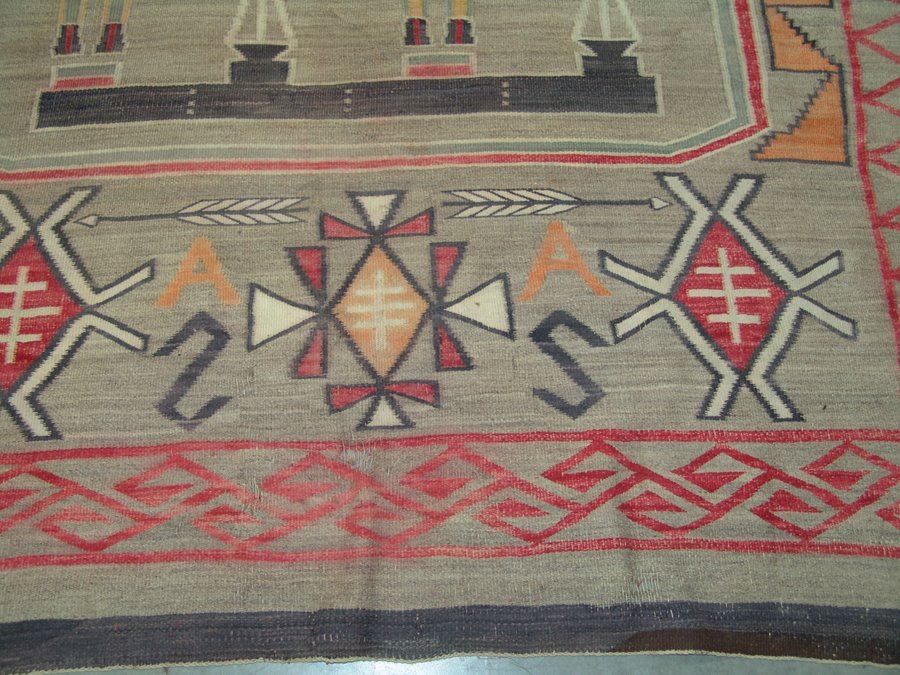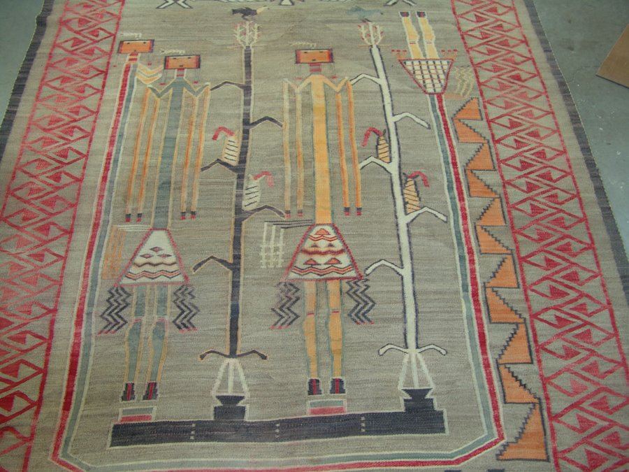Huge, rare, pictorial Yei figured rug with sand painting center, crystal style symbols and Klagetoh style border and with bald eagle, two bird, corn stalks with corn, arrow figures, and more. A rare and amazing rug. Fair condition, shows much use and wear, exposed warp, etc.110" x 76"