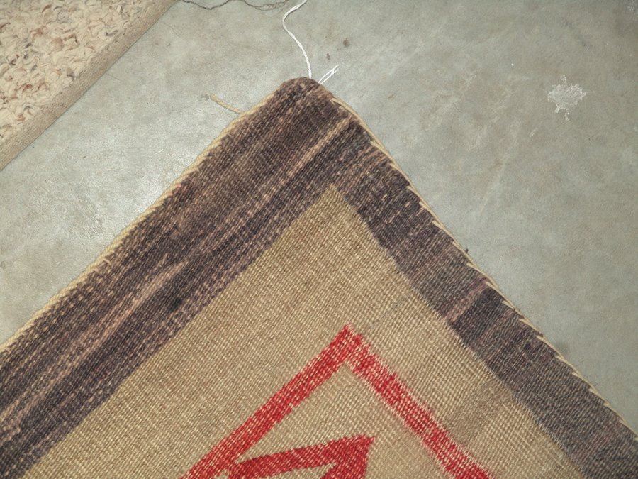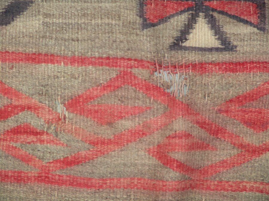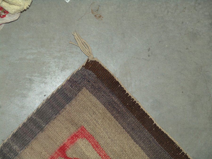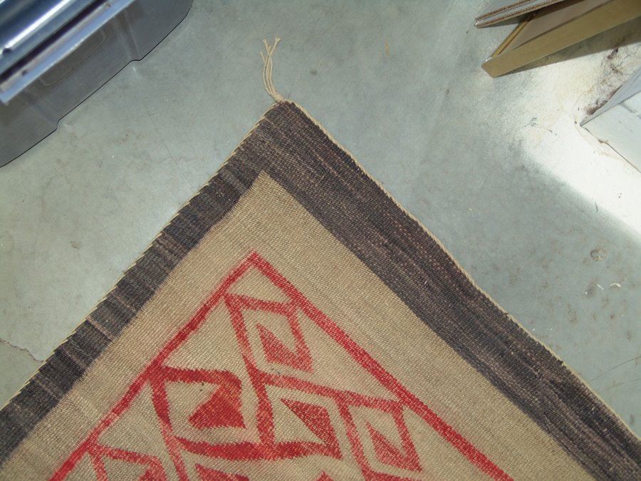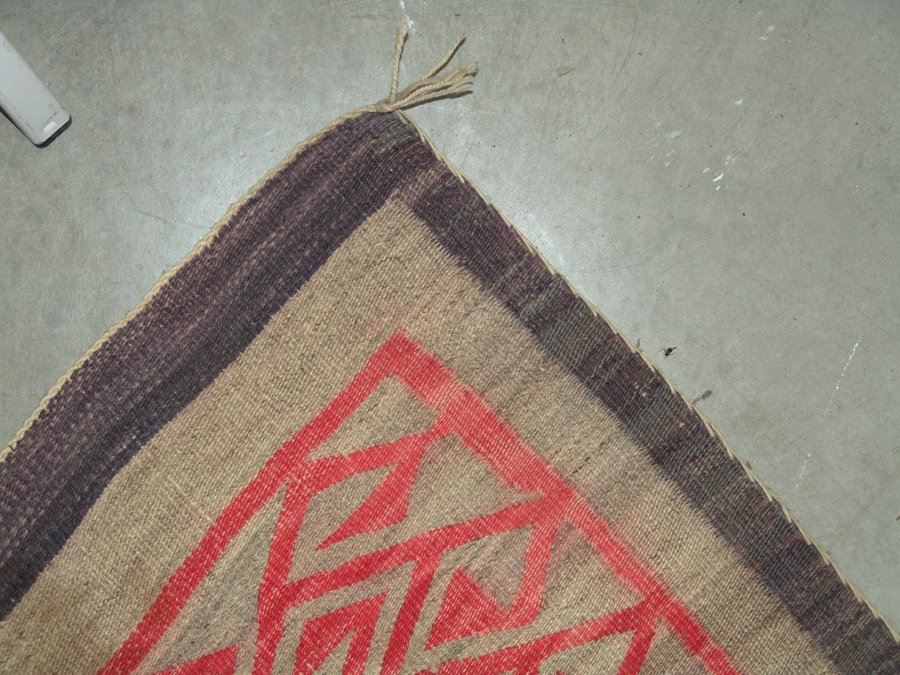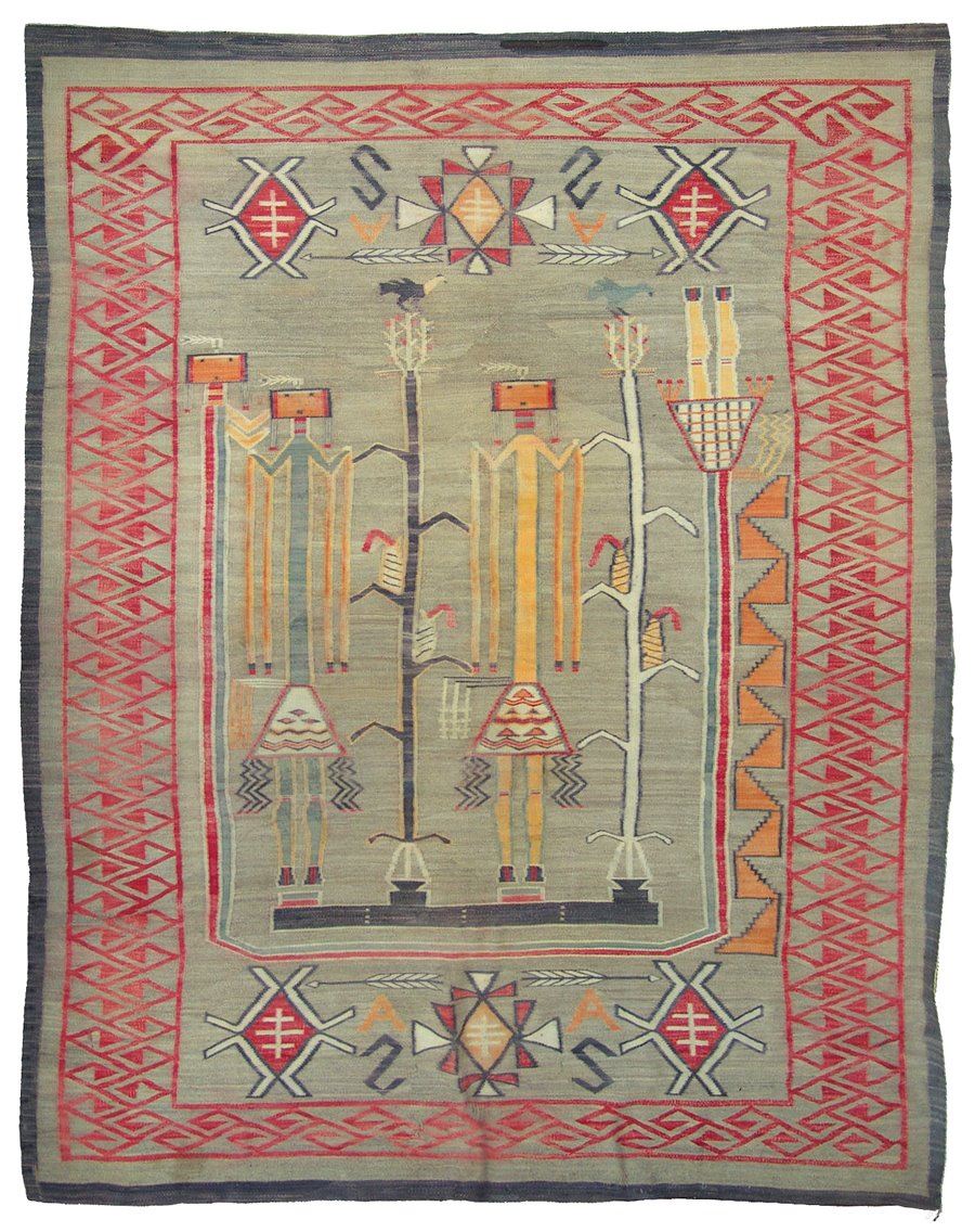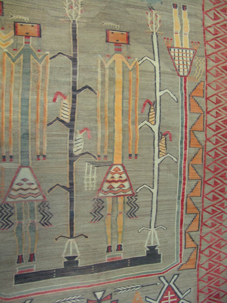 Huge, rare, pictorial Yei figured rug with sand painting center, crystal style symbols and Klagetoh style border and with bald eagle, two bird, corn stalks with corn, arrow figures, and more. A rare and amazing rug. Fair condition, shows much use and wear, exposed warp, etc.110" x 76"