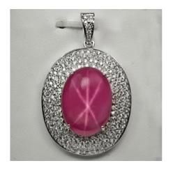 An 18 Karat White Gold, Star Ruby and Diamond Pendant, containing one oval Star Ruby weighing approximately 20.39 carats and 181 round brilliant diamonds weighing approximately 1.58 carats.