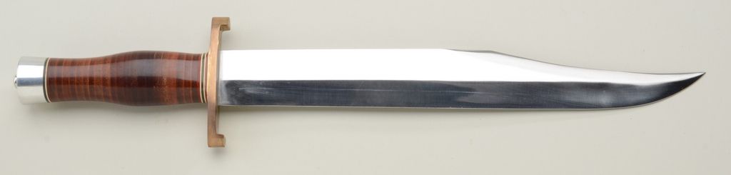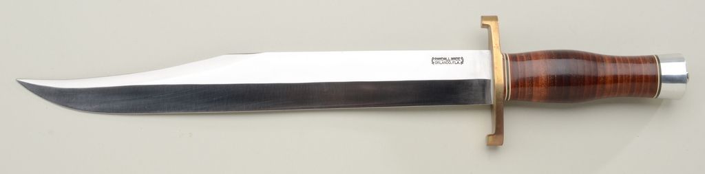 Huge Randall (Orlando, FLA) bowie knife, approx. 18” overall with an approx. 13” blade with stacked leather grip and brass cross guard in excellent, like new condition. Est.: $600-$1,200.