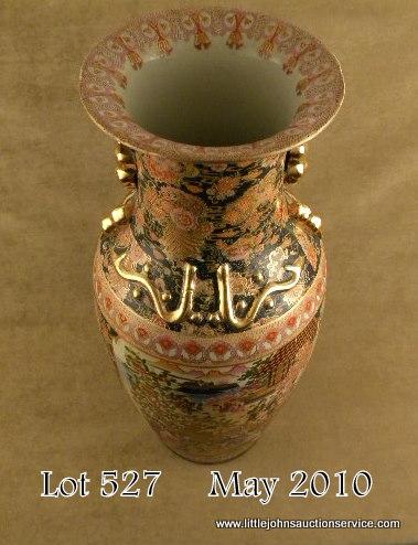 Huge Satsuma ornate vase, approx. 32” high and approx. 13” in diameter at largest area in overall excellent condition at time of description and appearing to have been made over 30 years ago; two large panel scenes of early Japanese life withmen and women interacting around a traditional Japanese home showing water and mountains in the background and lots of floral designs covering the entirety of the vase; lovely colors accented by gold painted borders and trim; would make a greatentryway display piece. Est.: $250-$450.