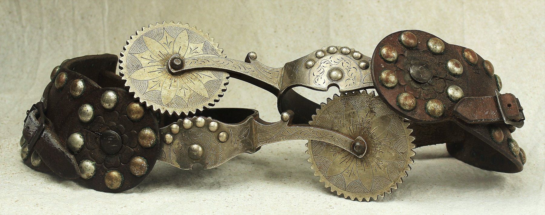 Magnificent single overlaid spurs with beautifully engraved silver and domes. Set off by incredible huge saw tooth silver overlaid rowels. Unmarked, but in a classic known Visalia pattern. Accompanied by a great pair of straps.