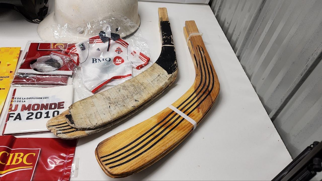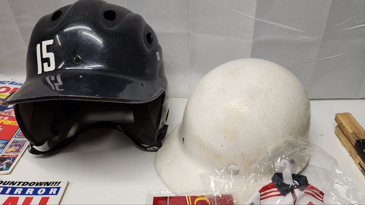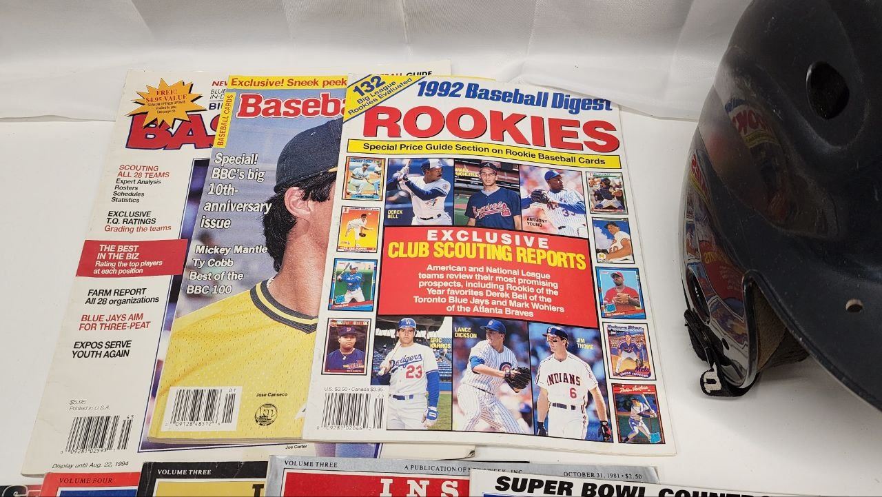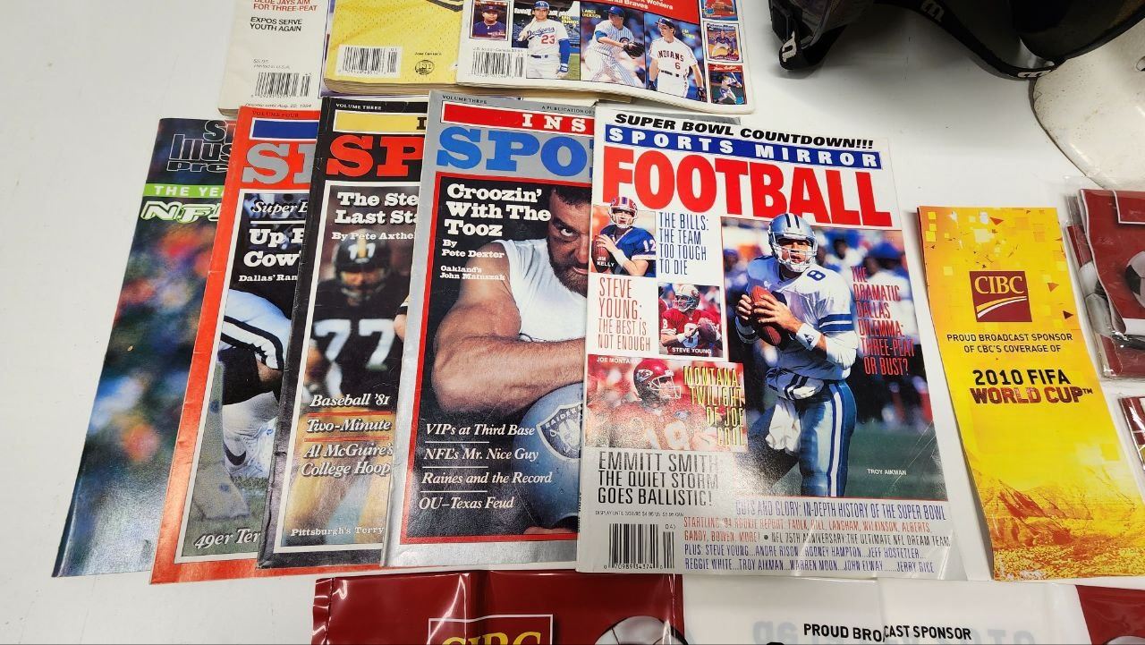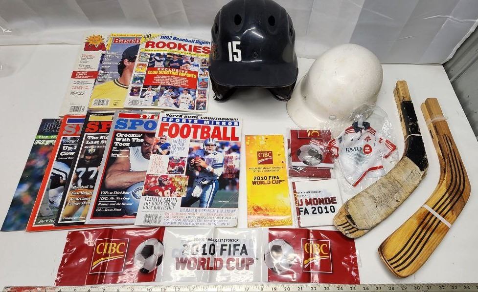 Huge lot of Sports Magazines, Memorabilia, Hockey sticks and assorted helmets/hardhat