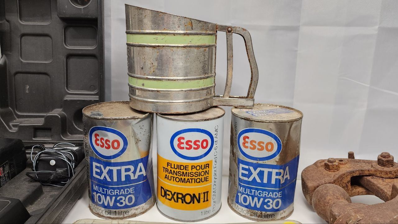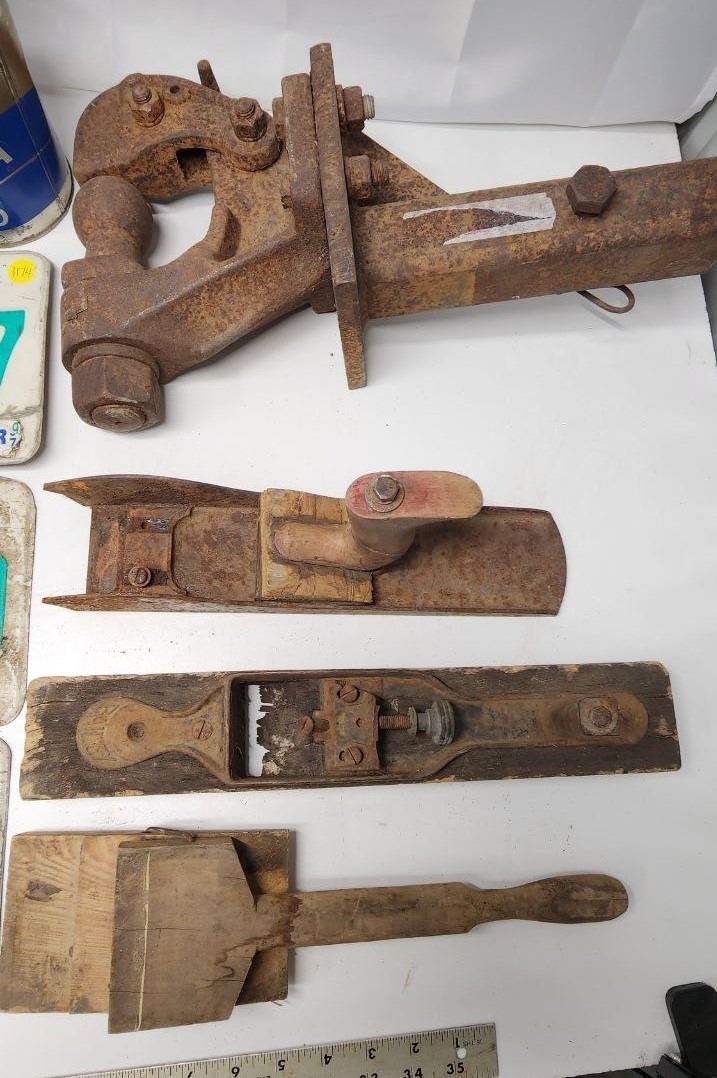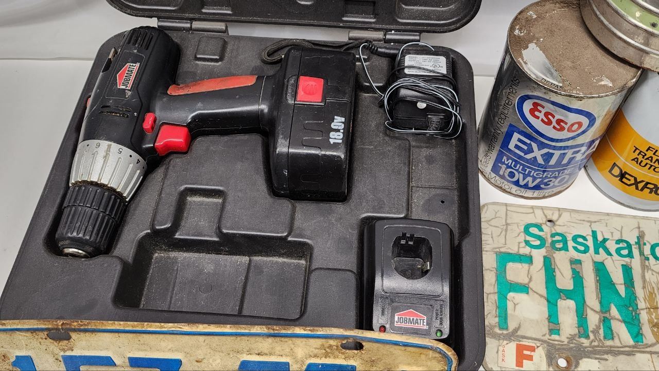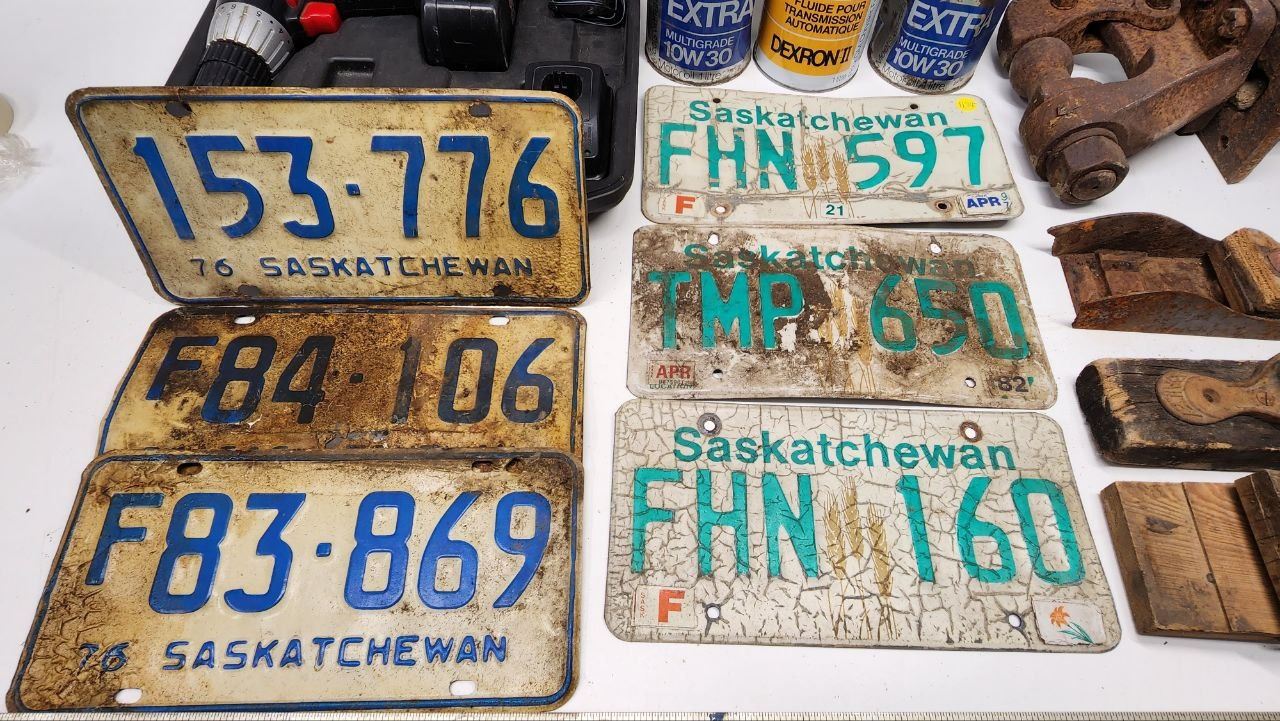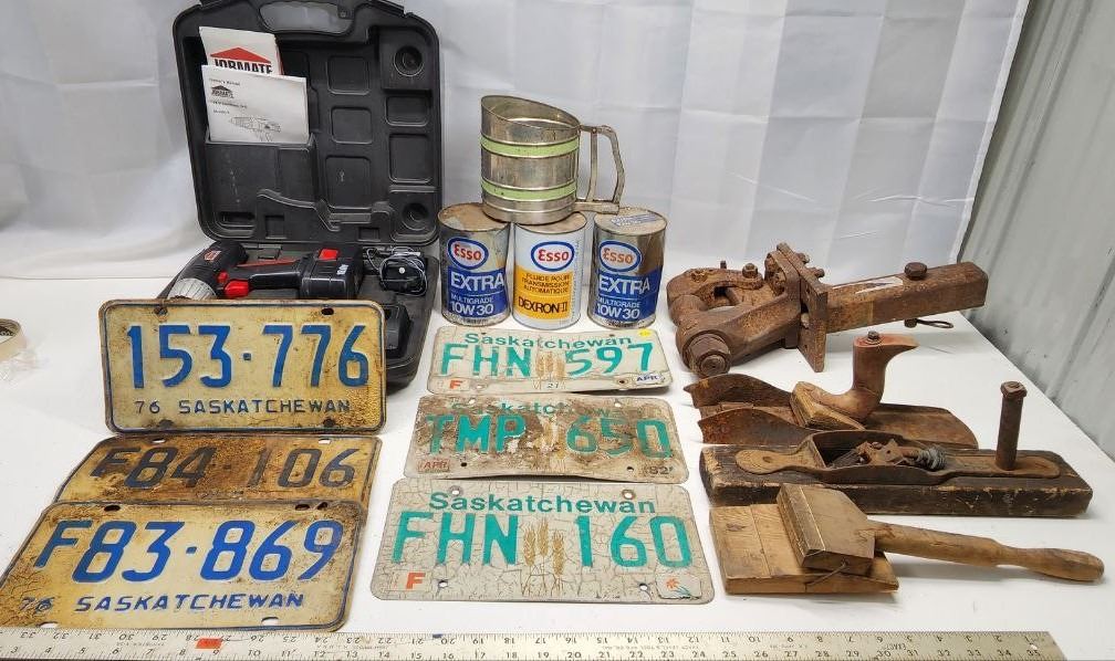 Huge lot of Vintage License plates, Wood Planers, Sift-Chine Container, Drill with case and accessories