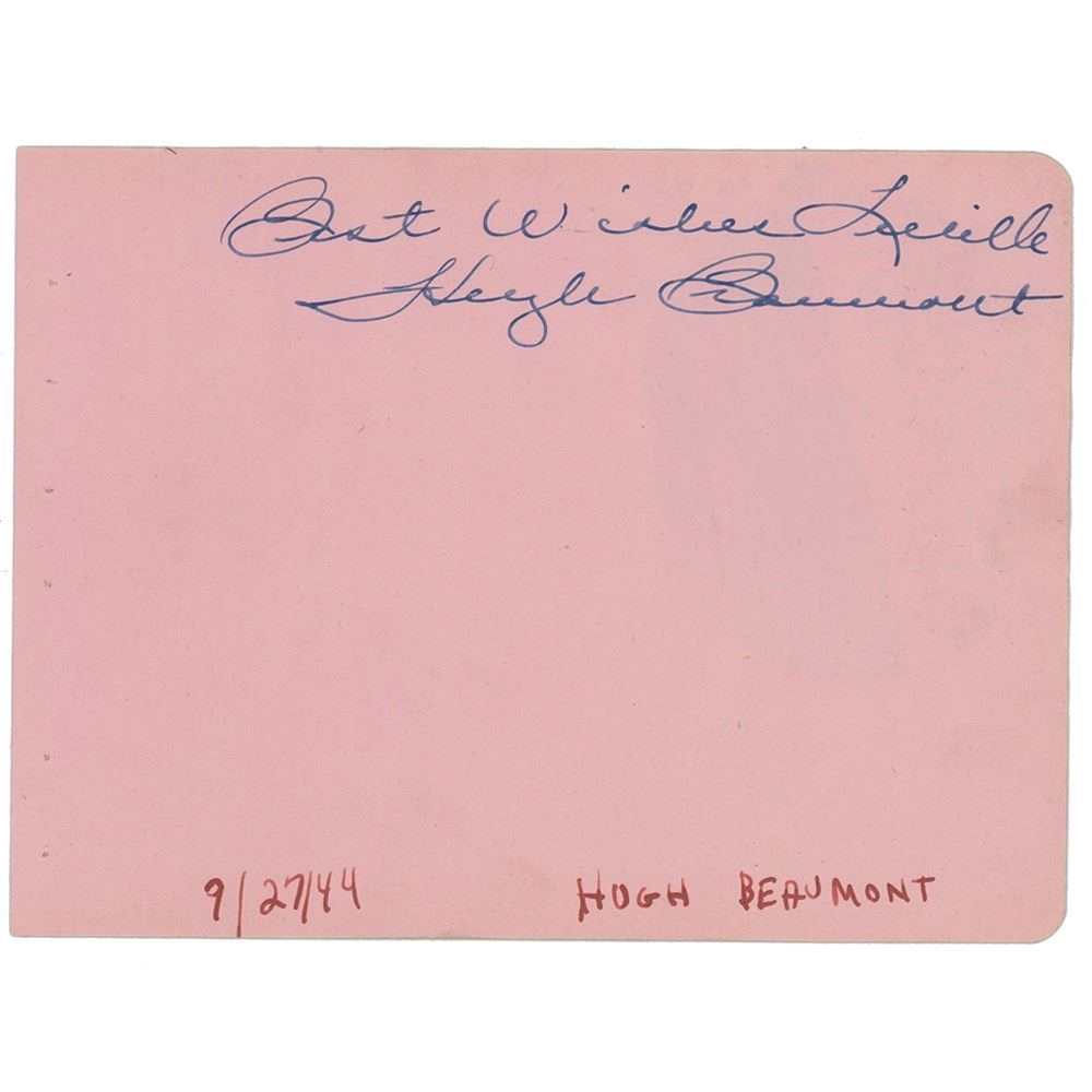 American actor and television director (1909–1982) who is best known for his portrayal of Ward Cleaver on the television series Leave It to Beaver. Very scarce vintage fountain pen signature and inscription, "Best wishes Lucille, Hugh Beaumont,” on a pink 6 x 4.5 album page, with a collector's date notation of September 27, 1944; also signed on the reverse by Spring Byington. In fine condition.