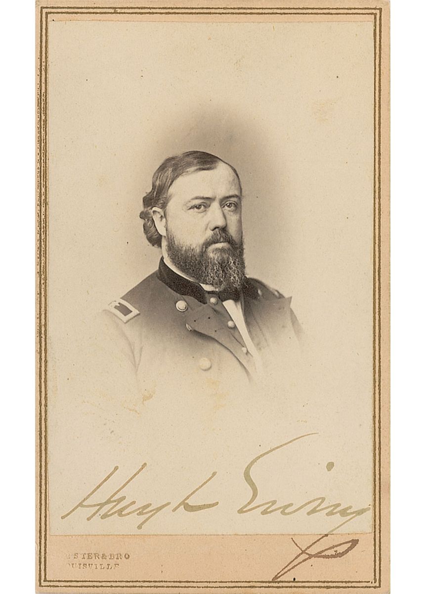 Union officer (1826-1905) and brother-in-law of William T. Sherman. He flanked the enemy at Antietam, and discovered correspondence between Jefferson Davis and Franklin Pierce. Original 2.25 x 4 carte-de-visite photo by Ster and Bro. of Louisville, signed below the image in black ink, “Hugh Ewing.” In fine condition, with mounting remnants on reverse.