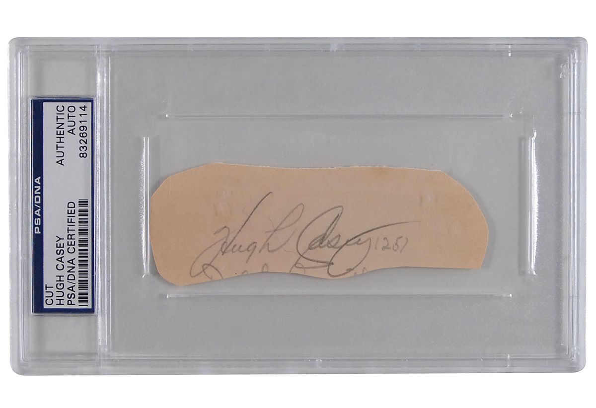 Major League pitcher (1913–1951) who died from a self-inflicted gunshot wound; his teams included the Brooklyn Dodgers and New York Yankees. Vintage pencil signature, “Hugh Casey,” on an off-white 4 x 1.5 slip irregularly clipped from a larger sheet. Encapsulated in a plastic PSA/DNA authentication holder. In fine condition.