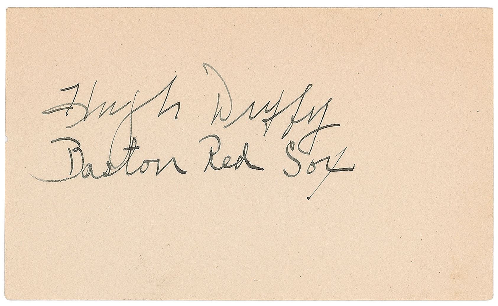 Vintage fountain pen signature, "Hugh Duffy, Boston Red Sox,” on a 5 x 3 card. In fine condition.
