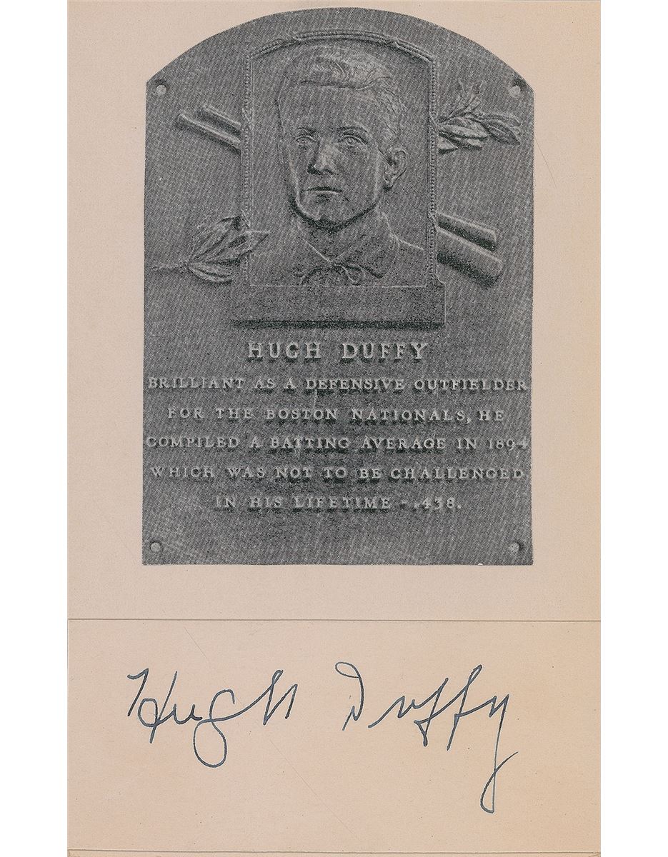 Defensive outfielder and triple crown member (1866–1954) who, despite his small stature, assembled a string of ten straight .300-plus seasons. Ink signature, “Hugh Duffy,” on an off-white 3.5 x 1.5 clipped card affixed to a larger 3.5 x 5.75 card bearing an affixed image of a Hall of Fame plaque honoring Duffy. In fine condition.