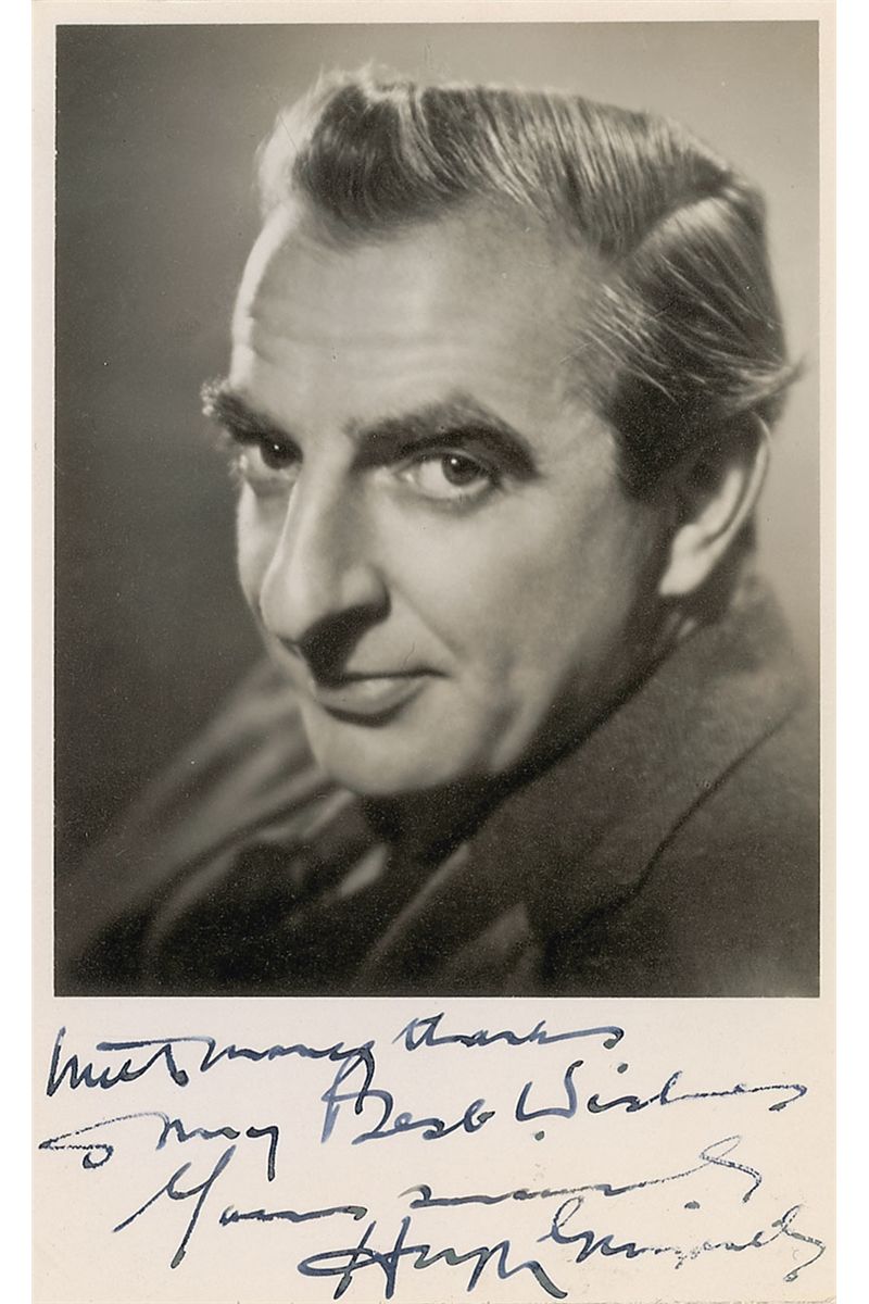 Welsh actor (1912–1980) who won an Academy Award for his supporting role in the 1959 epic Ben-Hur. Uncommon vintage matte-finish 3.5 x 5.5 photo, signed in fountain pen, “With many thanks & my best wishes, Yours sincerely, Hugh Griffith.” In fine condition, with a few subtle surface marks and some slight irregular ink adhesion to end of signature.