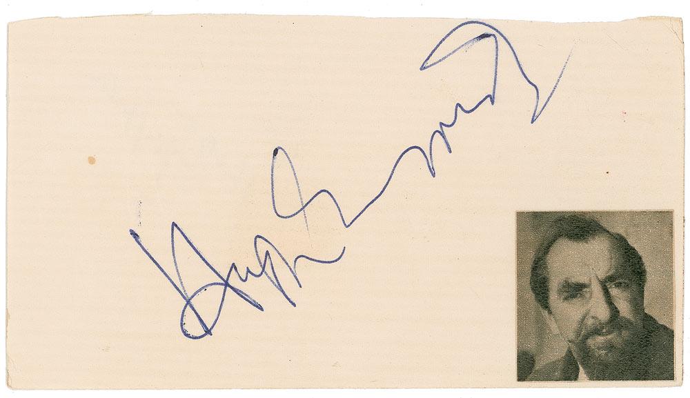 Welsh actor (1912–1980) who won an Academy Award for his supporting role in the 1959 epic Ben-Hur. Ballpoint signature, “Hugh Griffith,” on an off-white 5 x 2.75 slip. Creases to the upper right corner, light toning, trimmed top edge, some light horizontal lines at edges from prior storage in a magnetic photo album, and a small newsprint image affixed at the lower right corner, otherwise fine condition.