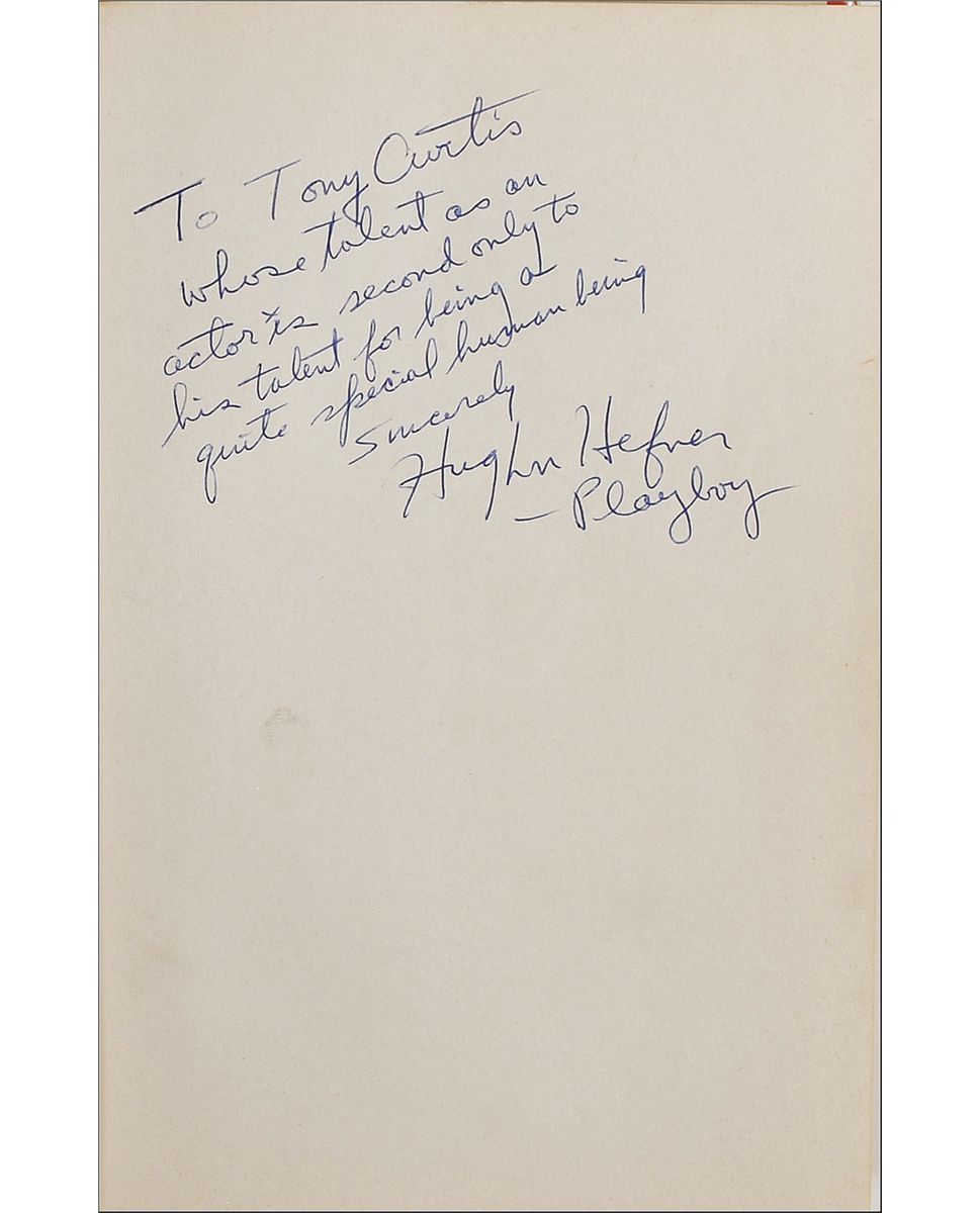 Signed book: The Bedside Playboy. Chicago: Playboy Press, 1963. Hardcover with dustjacket, 6.5 x 9.25, 511 pages. Signed and inscribed on the first free-end page in blue ballpoint, “To Tony Curtis, Whose talent as an actor is second only to his talent for being a quite special human being, Sincerely, Hugh Hefner—Playboy.” Some light toning, a few trivial smudges to the signature page, scattered staining to the front cover, and some mild to moderate paper loss to the spine and bottom right corner of the dustjacket, otherwise fine condition. Curtis, a regular at the Playboy mansion and a dear friend of Hefner’s, was well-known for his multiple relationships and marriages, including those with Janet Leigh, Marilyn Monroe, and Christine Kaufmann.