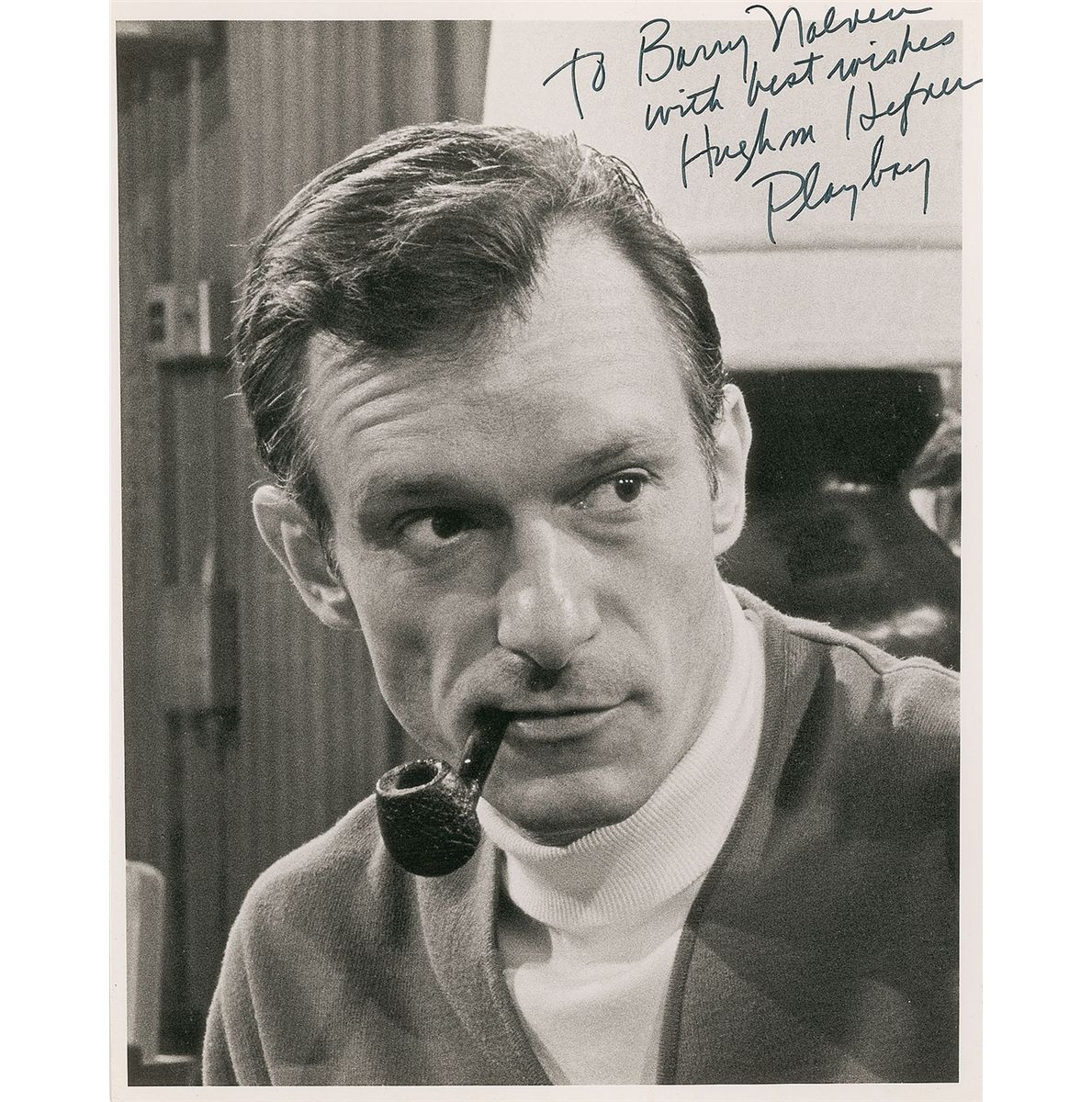 Matte-finish 8 x 10 photo of the Playboy founder in his earlier years, signed and inscribed in black felt tip, “To Barry Nalven, with best wishes, Hugh M. Hefner, Playboy.” In fine condition.