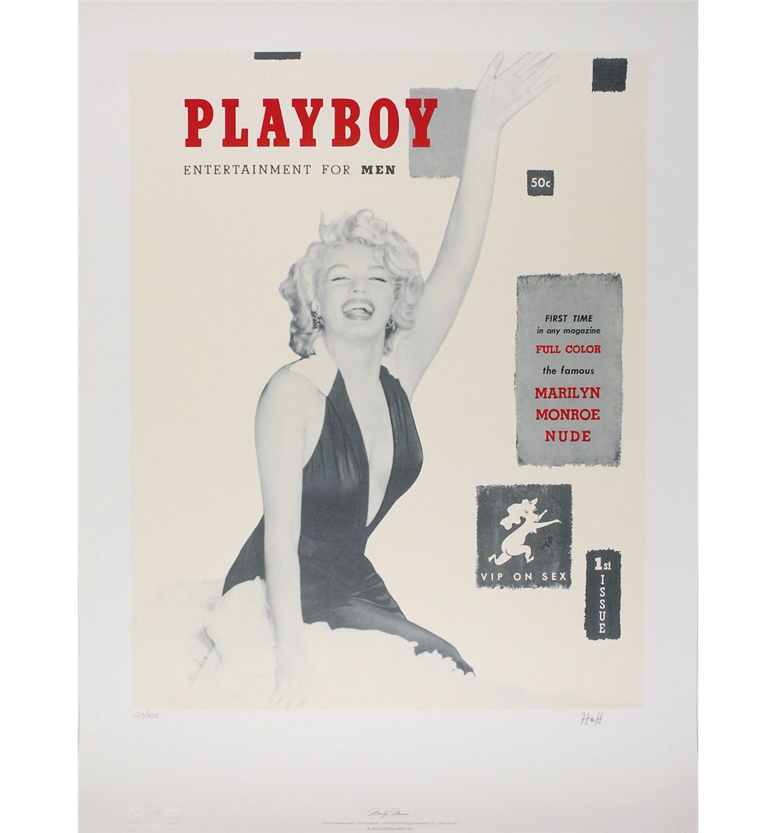 Color limited edition 26 x 35 print of the first issue of Playboy featuring Marilyn Monroe, numbered 120/950, signed in the lower border in pencil by Hefner, “Heff.” In fine condition.