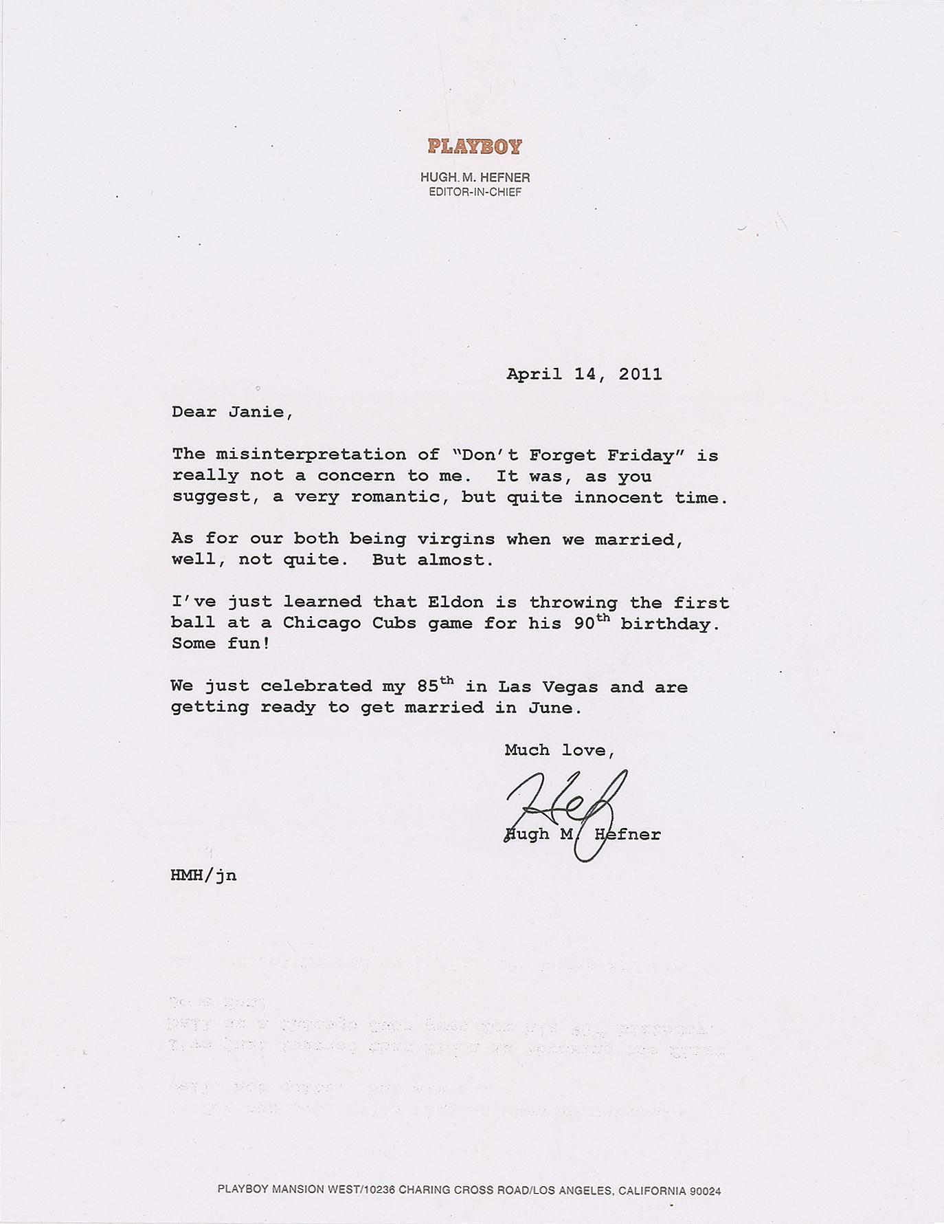 TLS signed “Hef,” one page, 8.5 x 11, Playboy letterhead, April 14, 2011. Letter to Janie, in full: "The misinterpretation of 'Don't Forget Friday' is really not a concern to me. It was, as you suggest, a very romantic, but quite innocent time. As for our both being virgins when we married, well, not quite. But almost. I've just learned that Eldon is throwing the first ball at a Chicago Cubs game for his 90th birthday. Some fun! We just celebrated my 85th in Las Vegas and are getting ready to get married in June." In fine condition. On December 24, 2010, Hefner became engaged to Crystal Harris, but she broke off their engagement on June 14, 2011, five days before their planned wedding. The couple subsequently reconciled and married on December 31, 2012.