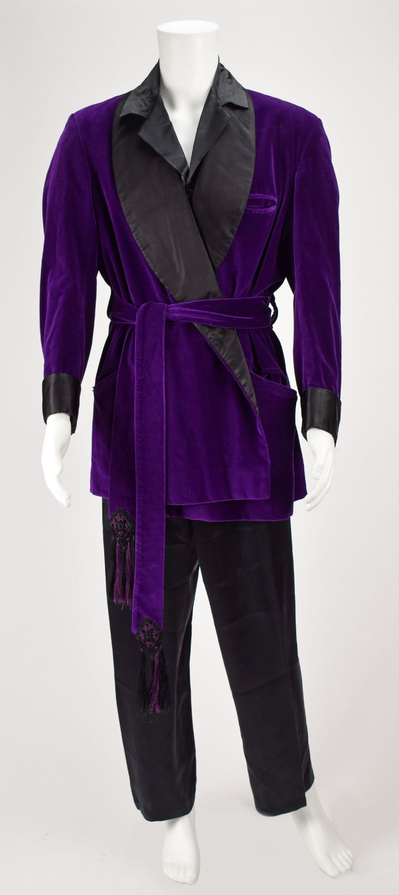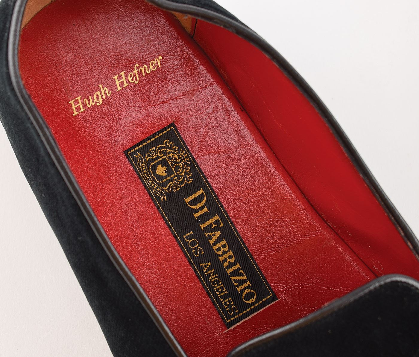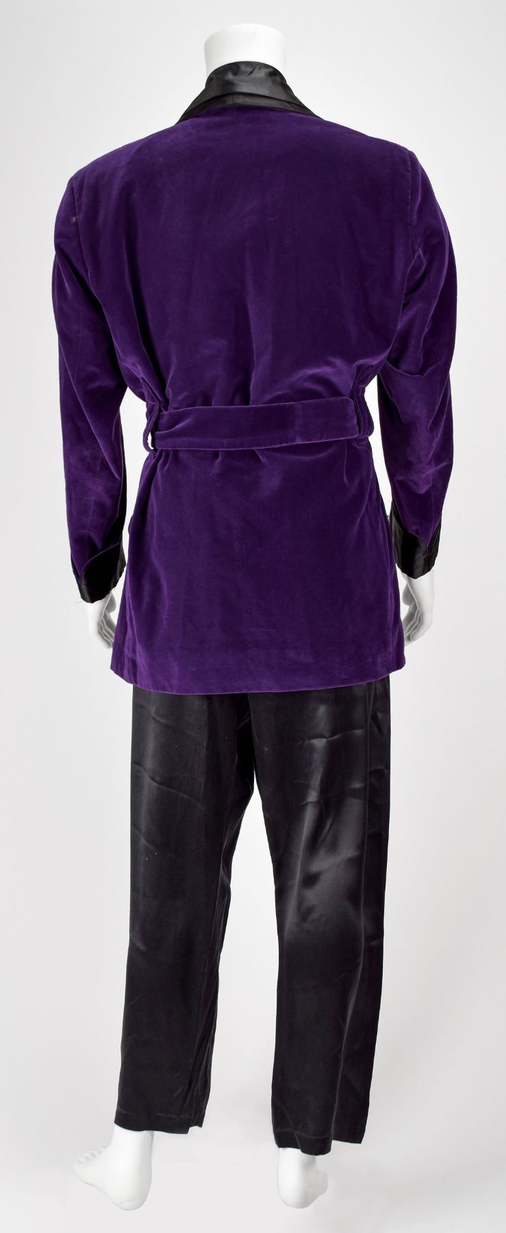 Amazing assortment of clothing from the personal wardrobe of Playboy mogul Hugh Hefner, which is highlighted by his purple velvet smoking jacket by Rick Pallack, size large, with black satin shawl collar and cuffs, and self-tie tassel-tipped belt closure. Also included is a pair of black silk pajamas consisting of a button-front silk pajama top with drawstring and elastic waist pajama bottoms; and a pair of black suede slippers with red leather insoles, 11.5? in length, custom-made by Di Fabrizio of Los Angeles, with inserts embossed in gold lettering, “Hugh Hefner.” The slippers are accompanied by the original Di Fabrizio shoe bag. In overall fine condition. Personally worn by the pipe-smoking mogul of Playboy magazine, this smoking jacket and nightwear ensemble instantly brings to mind the lavishly dressed-down style of a true American icon.