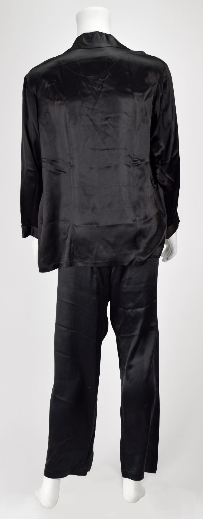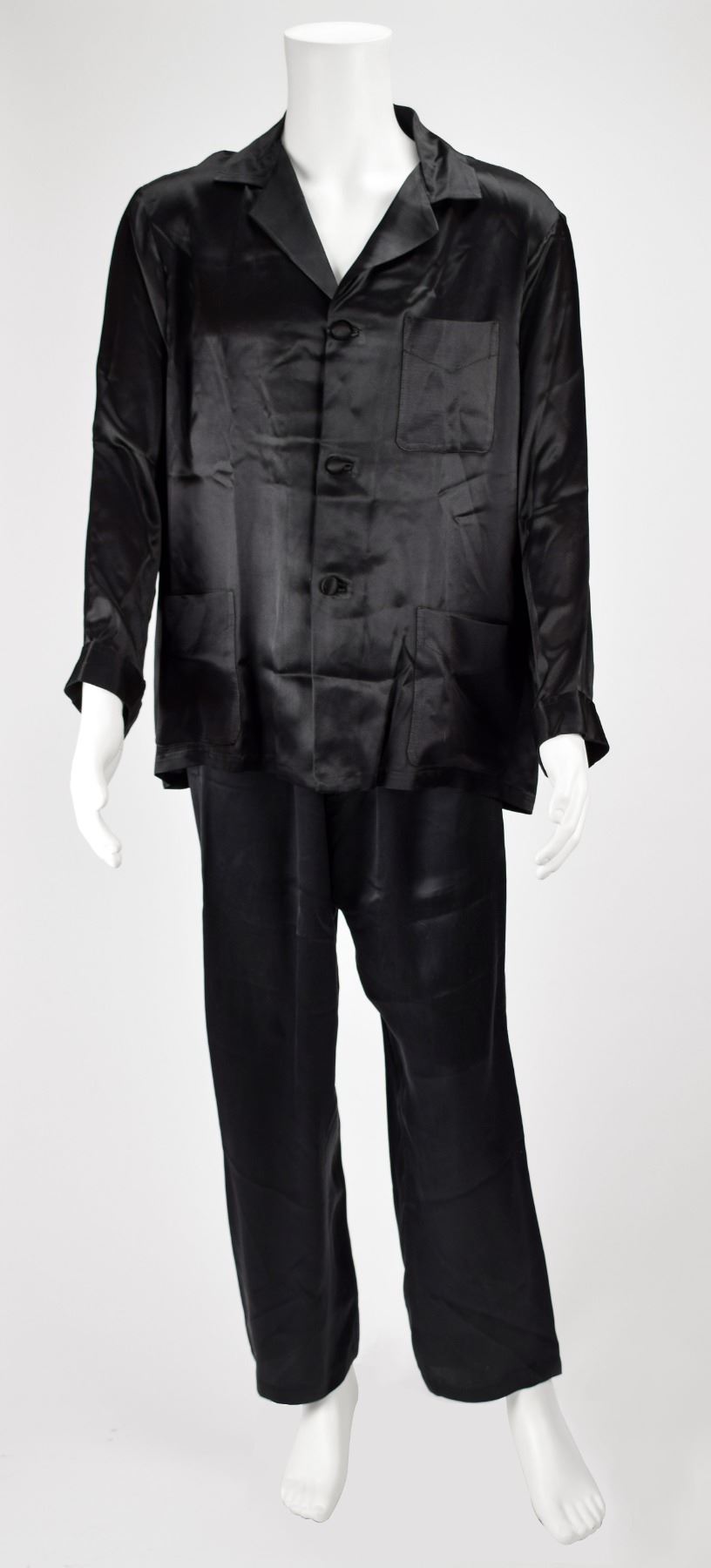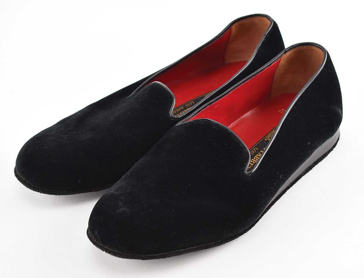 Amazing assortment of clothing from the personal wardrobe of Playboy mogul Hugh Hefner, which is highlighted by his purple velvet smoking jacket by Rick Pallack, size large, with black satin shawl collar and cuffs, and self-tie tassel-tipped belt closure. Also included is a pair of black silk pajamas consisting of a button-front silk pajama top with drawstring and elastic waist pajama bottoms; and a pair of black suede slippers with red leather insoles, 11.5? in length, custom-made by Di Fabrizio of Los Angeles, with inserts embossed in gold lettering, “Hugh Hefner.” The slippers are accompanied by the original Di Fabrizio shoe bag. In overall fine condition. Personally worn by the pipe-smoking mogul of Playboy magazine, this smoking jacket and nightwear ensemble instantly brings to mind the lavishly dressed-down style of a true American icon.