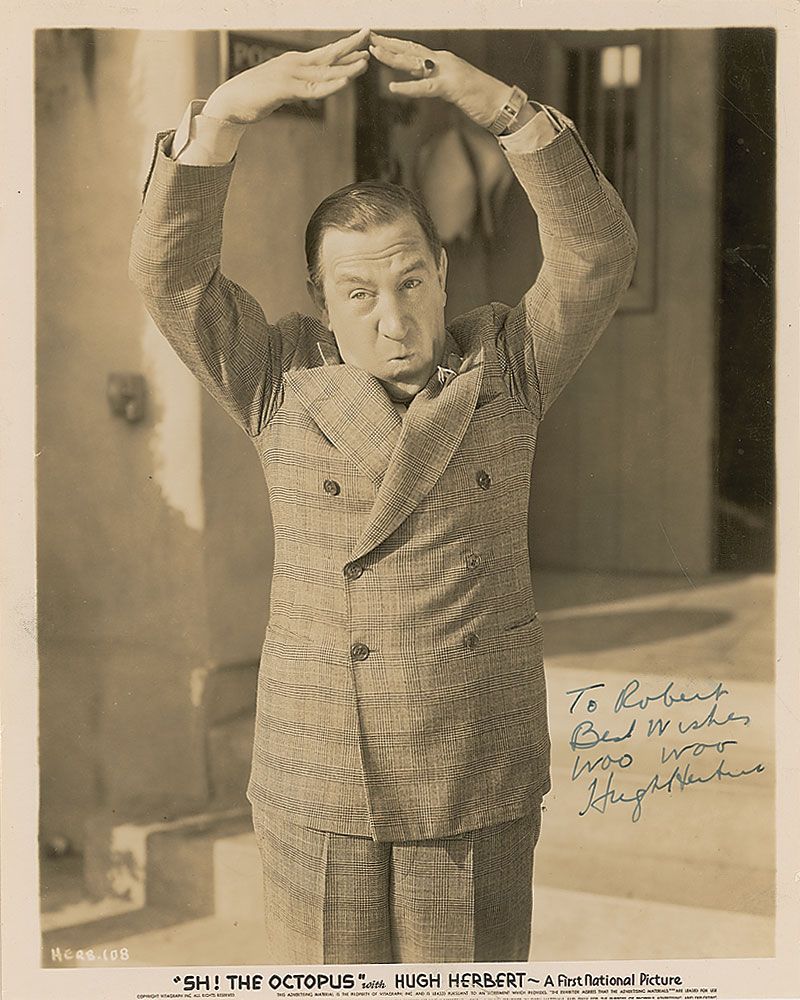 Vintage glossy 8 x 10 promotional photo of Herbert in Sh! The Octopus, signed and inscribed in fountain pen, “To Robert, Best wishes, Woo woo, Hugh Herbert.” Some light surface spotting and a ding to the right edge, otherwise fine condition.