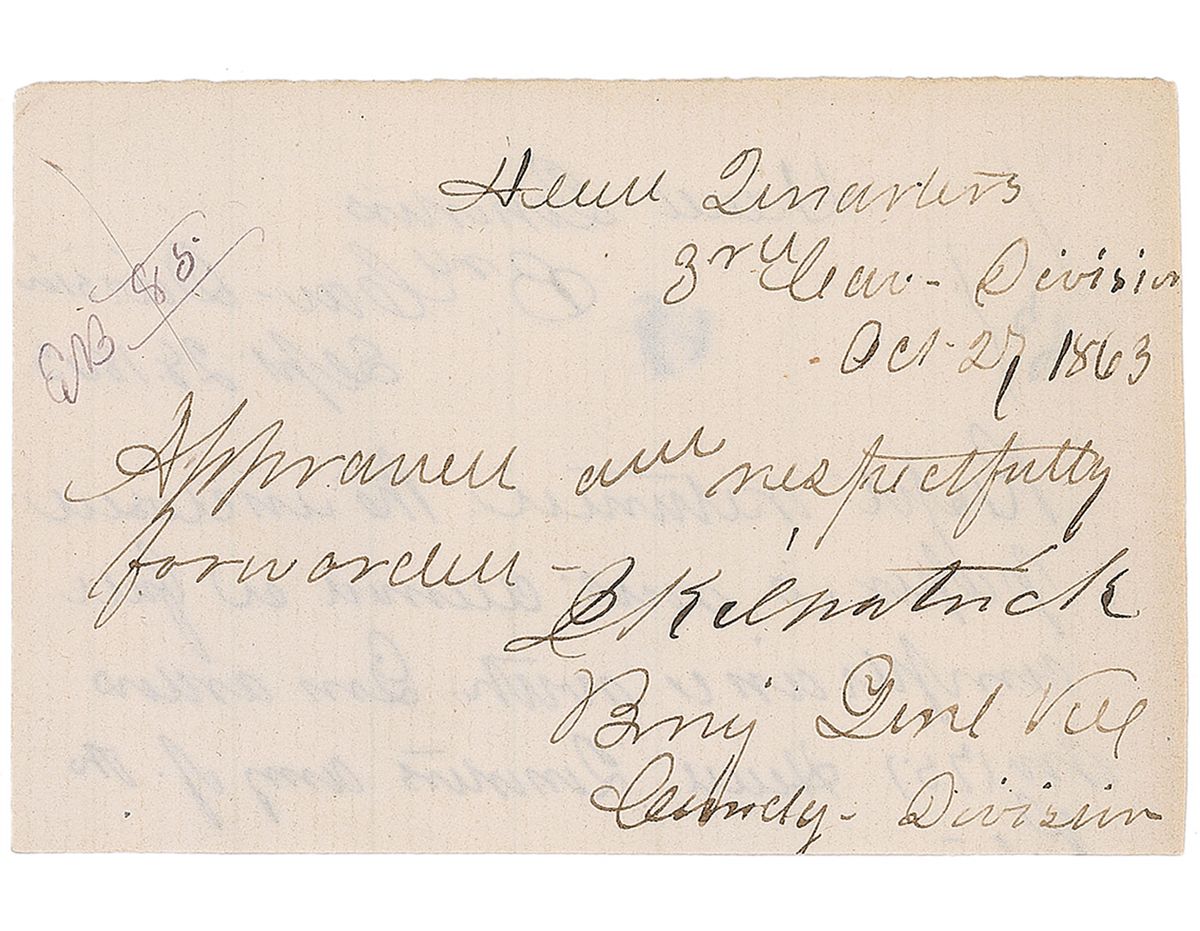 American military officer (1836–1881), who, as a general in the Civil War, earned the sobriquet ‘Kill-Cavalry’ for his gung-ho disregard for the lives of the soldiers under his command. Civil War–dated ink endorsement signature, “J. Kilpatrick,” concluding a manuscript note on an off-white 3.25 x 2 slip clipped from a docketing panel, October 27, 1863, in full: “Approved and respectfully forwarded.” In fine condition.