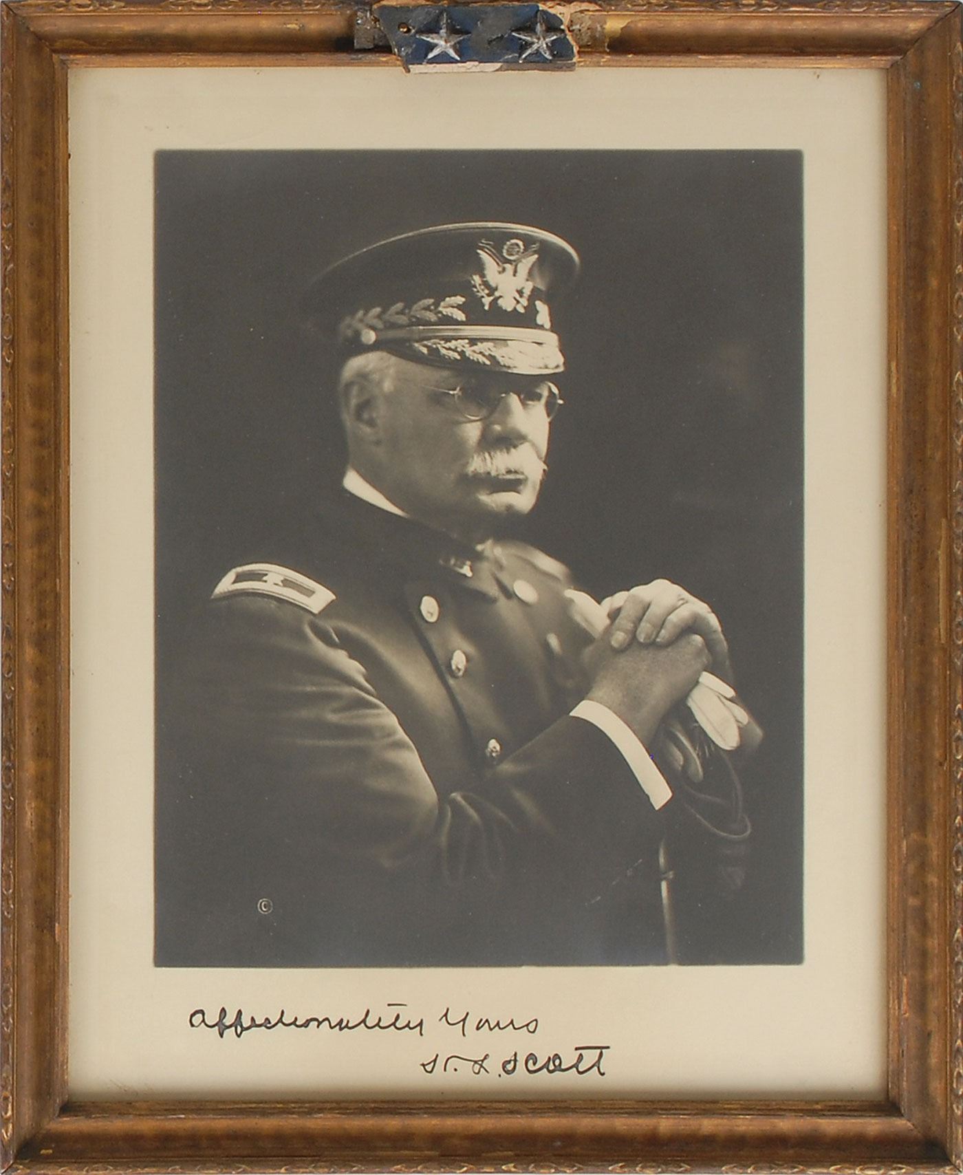 Career soldier (1853–1934) who served as superintendent of West Point from 1906 to 1910 and as Army chief of staff from 1914 to 1917; in this position he directed his energy toward preparing the US for possible entry into World War I, and was influential in winning early acceptance among civil officials of the notion of conscription. Handsome oversized matte-finish 9 x 11.75 portrait of Scott in uniform, boldly signed in the lower border in thick black ink, "Affectionately yours, H. L. Scott." Framed in its original frame, with cracks to the patriotic ornament at the top. In fine condition.