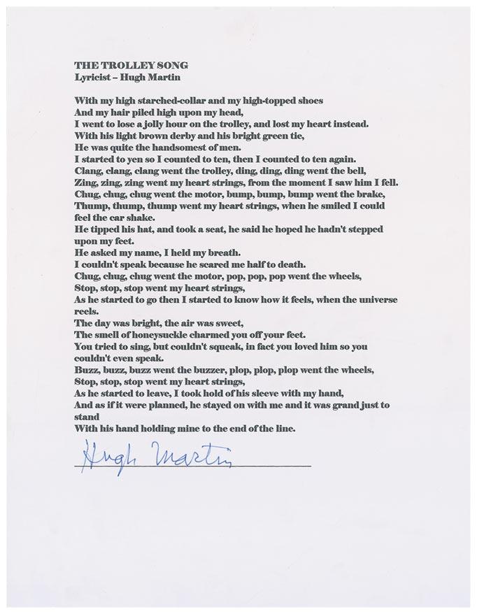 Musical theater and film composer, arranger, vocal coach, and playwright (1914–2011) best known for his score for the classic 1944 MGM musical Meet Me in St. Louis. Souvenir printed lyrics to ‘The Trolley Song’ on a white 8.5 x 11 sheet, signed at the bottom in blue felt tip, “Hugh Martin.” In fine condition.