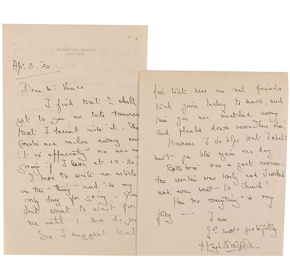 English novelist (1884–1941) who appeared in 1935’s David Copperfield. Two ALSs, both one page, both sides, one dated April 5, 1920, and the other dated October 17, 1929. The 1920 letter reads, in part: “I have to write an article on the thing and it’s my only day for going. You don’t want to wait for me until 1:30 do you? So I suggest…I keep April 23rd free (my last day in America) for lunch absolutely and if you can fit in well and good.” In fine condition, with some scattered light soiling to both. Accompanied by three unsigned candid photos of Walpole posing outdoors.