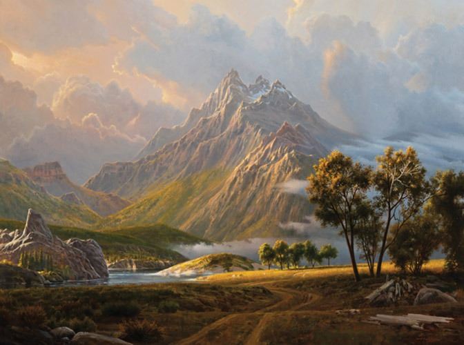 Bill Hughes’s monumental Western landscapes evoke a feeling as much as they describe a place. Working in the Hudson River School tradition as it was transplanted to and transformed by the vistas of the American West—consider Albert Bierstadt, Frederic Church, Thomas Moran, and Thomas Hill, for example—Hughes finds the spirituality in his highly detailed, realistic depictions of places that are, often in large measure, imaginative. Humans and animals moving through and at one with panoramas of bold light splashing on and edging even bolder colors wrought into trees, mountains, rocks, water—these, it seems, constituted Bill Hughes’s artistic aims.