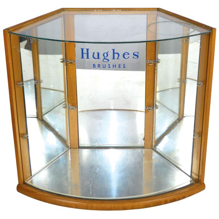 Hughes Brushes showcase with curved glass front, needs shelves, o/wise VG cond, 16"H x 18"W.