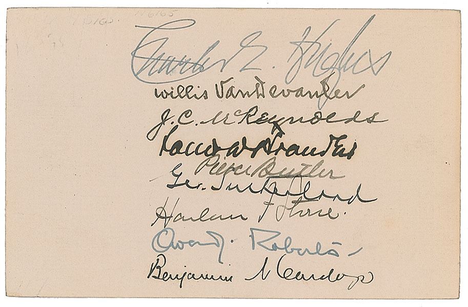 Vintage ink signatures of Charles Evans Hughes, Willis Van Devanter, James Clark McReynolds, Louis D. Brandeis, Pierce Butler, George Sutherland, Harlan F. Stone, Owen J. Roberts, and Benjamin N. Cardozo on an off-white 5 x 3.25 card. In fine condition. A highly desirable piece signed by the full 1932–1937 Hughes Court, whose landmark decisions in cases like Schechter Poultry Corp. v. United States, United States v. Butler, and West Coast Hotel Co. v. Parrish have helped to define life in modern America.