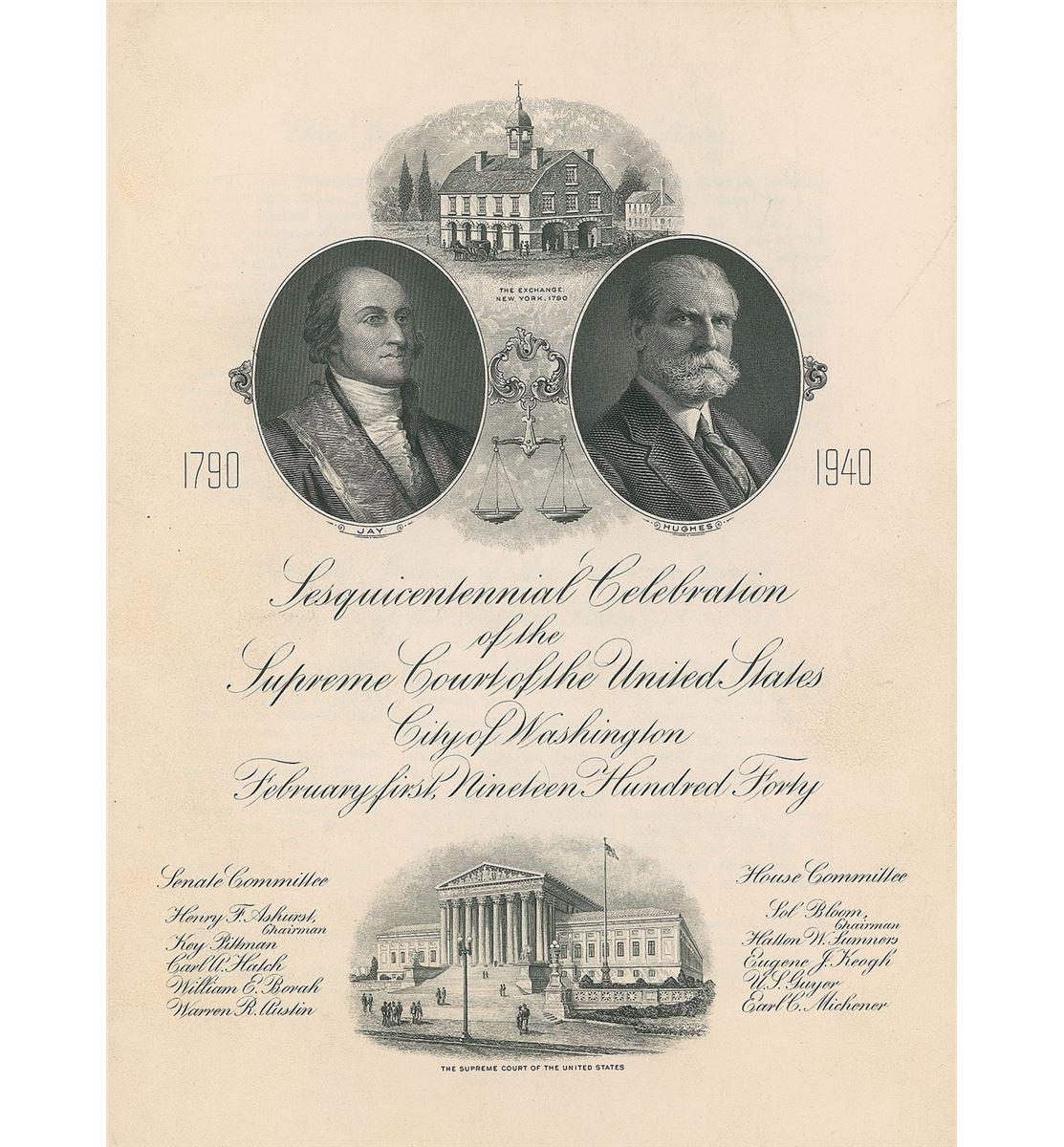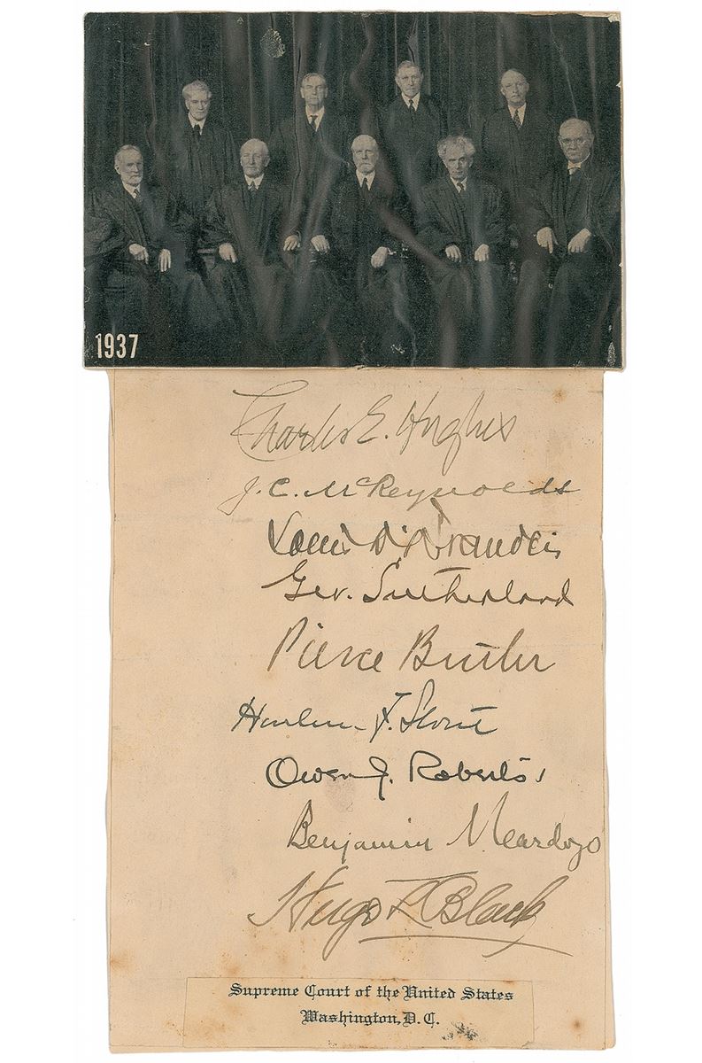 Fountain pen signatures of all nine members of the 1937 Supreme Court on an off-white 4 x 5.5 sheet, including: Charles E. Hughes, James C. McReynolds, Louis D. Brandeis, George Sutherland, Pierce Butler, Harlan F. Stone, Owen J. Roberts, Benjamin N. Cardozo, and Hugo Black. A clipped magazine image of the justices is affixed at the top, and a clipped portion of Supreme Court letterhead is affixed at the bottom. In very good condition, with a horizontal fold passing through Butler’s signature, overall bends and creases, and foxing (primarily towards to bottom). Accompanied by an unsigned program for a celebration of the sesquicentennial of the Supreme Court on February 1, 1940. The date of these scarce signatures, all on a single page, can be targeted to a brief five-month period between August 19, 1937, the date Black joined the court, and January 17, 1938, when Sutherland retired.