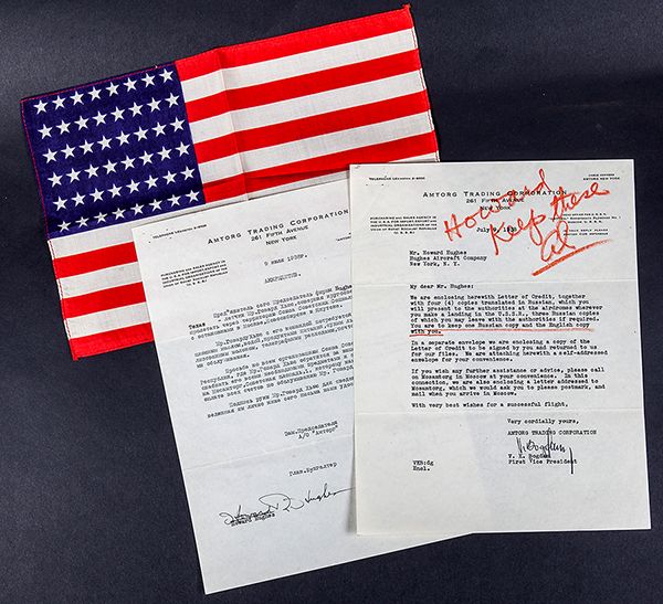 Hughes, Howard (1905-1976) American businessman, movie producer, and aviator, best remembered for being an eccentric, reclusive billionaire in his later years. Letter of Credit document signed ("Howard R. Hughes"), 1 page, 8½ x 11 in., Moscow, U.S.S.R., 9 July 1938. Accompanied by a typed letter from the Amtorg Trading Corporation, stating in part: "My dear Mr. Hughes: We are enclosing herewith Letter of Credit, together with four (4) copies translated in Russian, which you will present to the authorities at the airdromes whenever you make a landing in the U.S.S.R…. You are to keep one Russian copy and the English copy with you…" Also included is a small American flag which is said to have been carried on Hughes' 1938 around-the-world flight and a legal-size envelope addressed "To Whom It May Concern, Airdrome, Moscow, U.S.S.R." and postmarked July 10, 1938, New York City. The envelope has "Howard Hughes Goodwill Flight" and a Russian airmail stamp beneath the cancelled U.S. stamps. In July 1938, Hughes and a crew of four circumnavigated the globe in only three days and 19+ hours. They were given a ticker-tape parade down Broadway upon their return. Items related to Hughes' 1938 flight are rare.