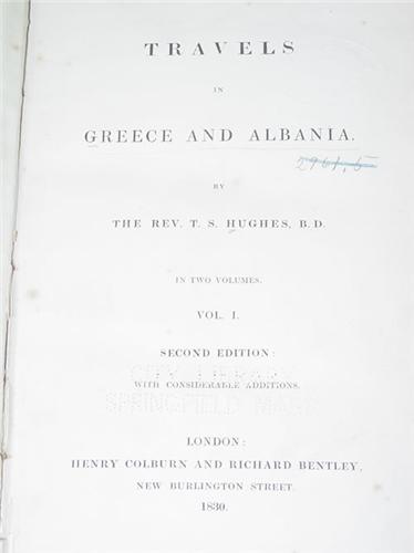 Hughes, Rev. T.S.. Travels in Greece and Albania - 2 Volumes. London: Henry Colburn and Richard Bentley, 1830. 8vo - over 7¾" - 9¾" tall. Hard Cover. Ex-Library. Good Condition. Second Edition. RARE. Complete with 2 fold-out Maps (one with tear), 1 Folding Plan (with tear), 7 folding plates and 6 full page plates (one is hand colored). Vignettes throughout. xvi, 511pp; xii, 512pp, 4 publisher ads, bound in 3/4 leather & marbled paper. Vol. 1 has library cloth over backstrip, taped hinges, rubbed covers with corner wear, title page loose. Vol. 2 has lower section of backstrip absent, upper backstrip edge absent, rubbed covers with corner wear, hinges taped, covers loose. Both have occasional foxing.