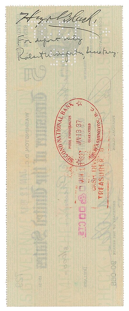 Treasurer of the United States/United State Senate check drawn for "Compensation," 8.5 x 3.25, filled out in another hand as payable to "Hugo L. Black, Chairman" for $1000, January 12, 1937, endorsed on the reverse by Black, "Hugo Black." In fine condition. At this time, Black was serving as chairman of the Senate Committee on Education and Labor as a senator from Alabama.