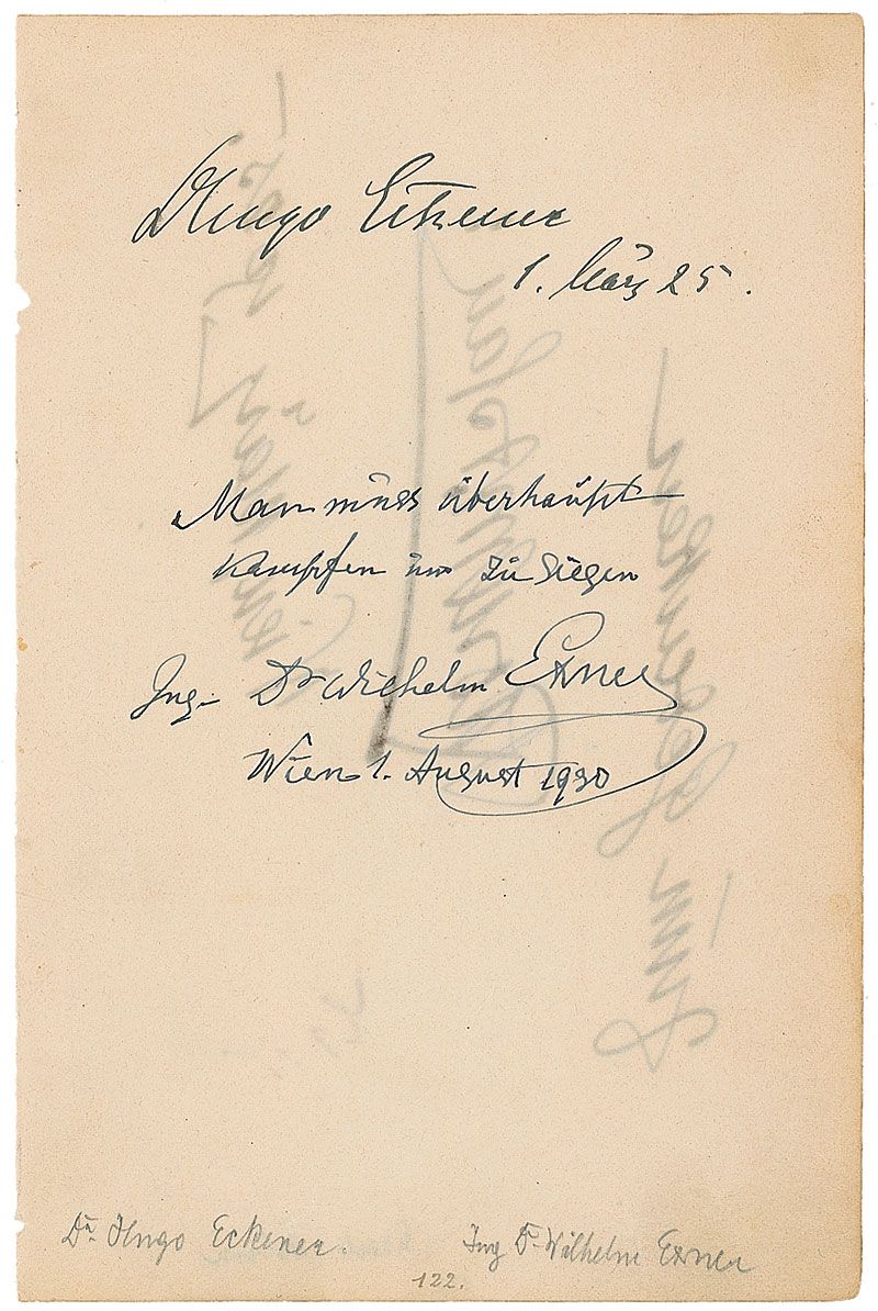 German aviation pioneer (1868–1954) who headed the Zeppelin Company, builders of the famed dirigibles Graf Zeppelin and Hindenburg. Ink signature, “Hugo Eckener, 1 Marz 25,” on an off-white 5 x 7.25 album page. Also signed with an AQS in German by technical innovator Wilhelm Exner, in full (translated): “Men must always fight to win. Dr. Wilhelm Exner, Wien 1 August 1930,” and boldly signed on the reverse by Austrian theater actor Raoul Aslan. In fine condition, with slight show-through from signature to reverse.