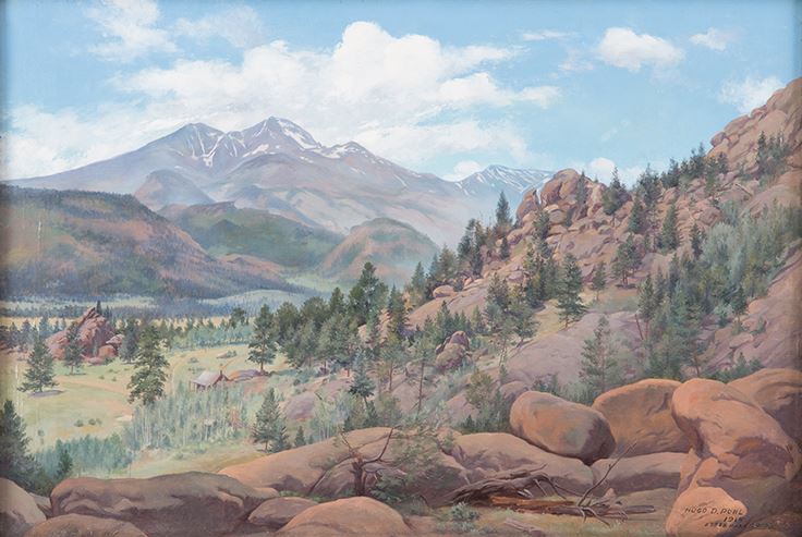 Hugo Pohl (1878-1960). Longs Peak, Estes Park, CO. 15 ? " x 22 ? " oil on canvas. Signed and dated 1914 lower right, Estes Park, CO.
