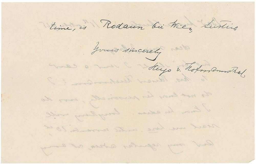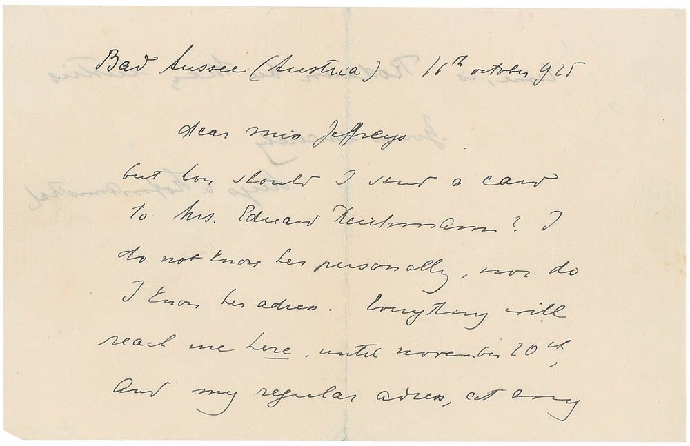 Austrian writer (1874–1929) who wrote novels, operas, poems, and essays. ALS signed “Hugo v. Hofmannsthal,” one page both sides, 8.25 x 5.25, Bad Aussee, Austria, October 16, 1925. Letter to “Dear Miss Jeffreys.” Translated in full “But how should I send a car to Mrs. Eduard Reichmann? I do not know her personally, nor do I know her address. Everything will reach me here until November 20th, and my regular address at any time is Rodan bei Wien, Austria.” In fine condition, with a central vertical fold. Accompanied by the original mailing envelope, addressed in Hofmannsthal’s hand.