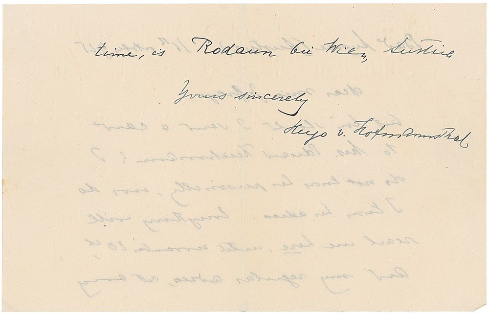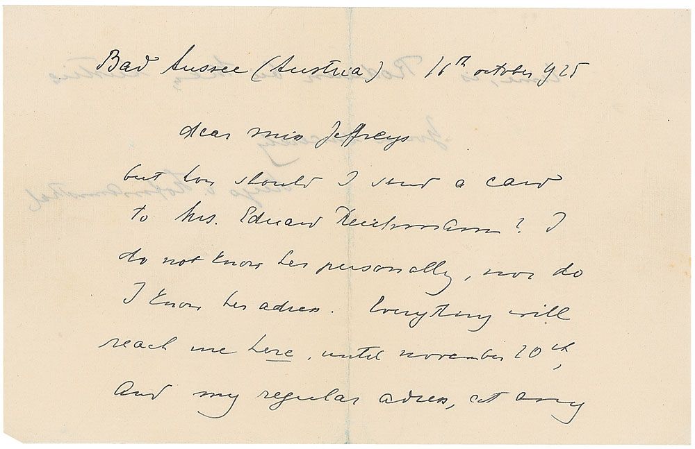 Austrian writer (1874–1929) who wrote novels, operas, poems, and essays. ALS signed “Hugo v. Hofmannsthal,” one page both sides, 8.25 x 5.25, Bad Aussee, Austria, October 16, 1925. Letter to “Dear Miss Jeffreys.” Translated in full: “But how should I send a car to Mrs. Eduard Reichmann? I do not know her personally, nor do I know her address. Everything will reach me here until November 20th, and my regular address at any time is Rodan bei Wien, Austria.” In fine condition, with a central vertical fold. Accompanied by the original mailing envelope, addressed in Hofmannsthal’s hand.