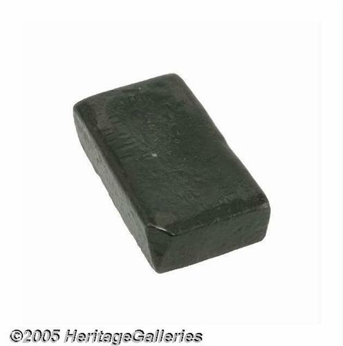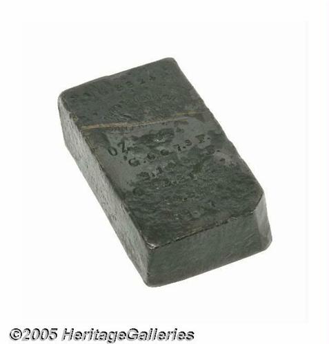 <B>Huhn & Luckhardt Copper-Silver-Gold Ingot Found in Waco, Texas.</B></I> The presence of this ingot in Waco, Texas represents a significant anomaly. It may be composed of metals mined near Van Horn, Texas in the Trans-Pecos region near the border of Texas and New Mexico about 75 miles west-southwest of Pecos, Texas during the modern discovery period, about 1880.<BR> Caesar A. Luckhardt had worked as a partner in the assaying and mining consulting firm of Riotte & Luckhardt in San Francisco since its formation about 1871. Eugene Riotte sold his interest in the firm to Ernest Huhn about 1875, and added the name "Nevada Metallurgical Works." Advertisements for Huhn & Luckhardt promoted their services as consulting mining engineers, metallurgists, and assayers. The pair advertised prolifically in the <I>Mining & Scientific Press,</B></I> and in both Langley's and Bishop's <I>San Francisco Directories.</B></I><BR> Huhn retired from the firm about 1880, and his name was dropped from advertisements and directory listings. Luckardt & Co. continued the operation of the Nevada Metallurgical Works until Luckhardt's retirement about 1907. Luckhardt and partners were the longest lasting assaying and mining consulting firm in San Francisco at the time, lasting at least 36 years.<BR> Copper-silver ores have been known in west Texas since historic times. About 1880, prospects near Van Horn, Texas were examined and the Hazel Mine and nearby properties were developed, with the first production reported in 1886. The deposit was cited as "argentiferous copper ore in a fissure vein with bornite and erubescite," according to David Day in his <I>Mineral Resources of the United States for the Calendar Year 1887,</B></I> published by the Government Printing Office in 1888. Within four years several mines in west Texas, including the Hazel mine and another near Shafter, located about 100 miles south of Pecos, were producing about $300,000-$400,000 in silver per year, according to Rothwell, Editor of the <I>Mineral Industry for the Year 1892,</B></I> published by the American Institute of Mining Engineers as a statistical supplement to the <I>Engineering and Mining Journal.</B></I><BR> Precious metals mining in Texas in the early years is not well documented. Located more centrally in the United States, Texas was not heavily prospected. The majority of activity was in or near states where significant quantities of gold were found, something relatively easy to find in trace amounts by panning stream channels. Silver, however, is more difficult to locate if not associated with larger quantities of gold. Since little gold was found in Texas, prospectors went elsewhere. Meanwhile, reporting of prospecting also was centered around geographic areas in America known for their precious metal deposits. Texas wasn't one of them, so the state's prospecting activities were off the radar for the two standard mining industry journals of the 1880 period, the <I>Mining and Scientific Press</B></I> and the <I>Engineering and Mining Journal.</B></I><BR> The Huhn & Luckhardt copper-silver ingot is a significant discovery because it may represent some of the first precious metal ores mines by Americans in Texas. As a copper-silver ingot, it is an anomaly. It represents a dore ingot containing metals from the original ore deposit in their approximate original compositional amounts. Few such ingots survive today, mostly because most dore ingots contain greater amounts of gold and silver. Copper, if present, was often removed in the melting process using a flux. It would only have been left behind in the ingot when used to represent the natural metals contained in ores from specific ore deposits, then publicly exhibited to promote the mine or a mining company. Exhibits of this nature were commonplace at the time, particularly in association with national or international fairs or exhibitions. The relative proportions of copper, silver, and gold in this ingot are very close to those found in the Van Horn District at and near the Hazel mine, as reported in industry journals of the period. This is an unusual match, not duplicated in any of the California ingots studied by the author (Fred Holabird) over the past twenty years. It is in this capacity that the ingot may have been used in Waco, to promote the mine or company. Huhn & Luckhardt were professional mining consultants, possibly hired to evaluate some of the small mines near Van Horn. They could easily have poured a copper-silver-gold dore ingot from their work on Van Horn ores and presented the same to company officials.<BR> This unusual item was found with a metal detector in Waco, Texas on the site of an old building that was being torn down. According to the <I>Ninth Annual Report of the State Mineralogist</B></I> for the year ending December 1, 1889, by the California State Mining Bureau, base bars "contain a large percentage of base alloys, usually comprising lead and antimony, or copper, differing in their contents in silver from one hundred to six hundred in one thousand, and often containing gold." This particular bar is primarily copper, as one can see from the deep scratch across the face. However, it is also 14% silver with just a trace of gold present. This bar was tested almost two years ago by Metallurgical Engineering Services (in Richardson) and the report they issued (since separated from the ingot) at that time bears out the assay stamped on the top of the bar. They performed two Energy Dispersive X-Ray Spectroscopy analyses, one of the blackened bar and the other of the scratched area. The blackened surface shows 62.39% copper, 15.08% silver, and 0.74% gold. The scratched area shows slightly different numbers with 82.13% copper (the difference being the presence of carbon, oxygen, chlorine, and iron on the blackened surface that is not found within the scratch), 15.89% silver, and 0.64% gold.<BR> A base bar is the naturally occurring ore put into bar form for tr