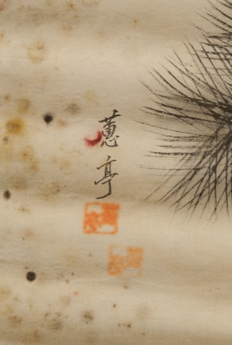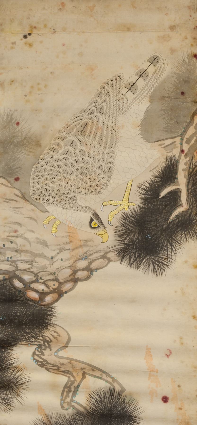 Ink and watercolor on paper. Featuring eagle and pine tree. Signed Hui Ting, inscribed with 2 artist seal. 16th-18th century. 108 x 35 cm. Provenance: collection from United State collector since 1945 in Japan and China; found in basement after his passing.