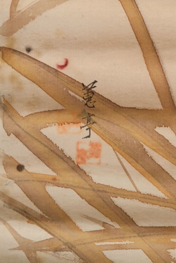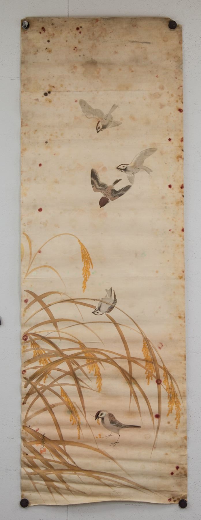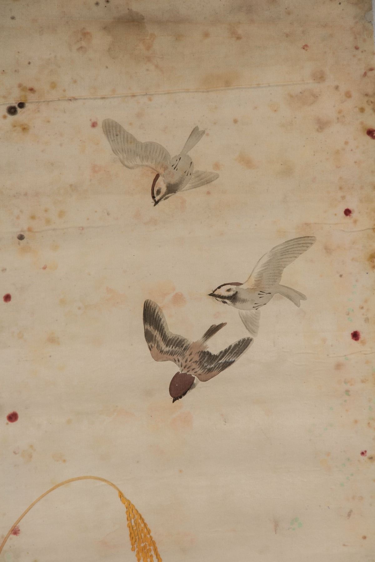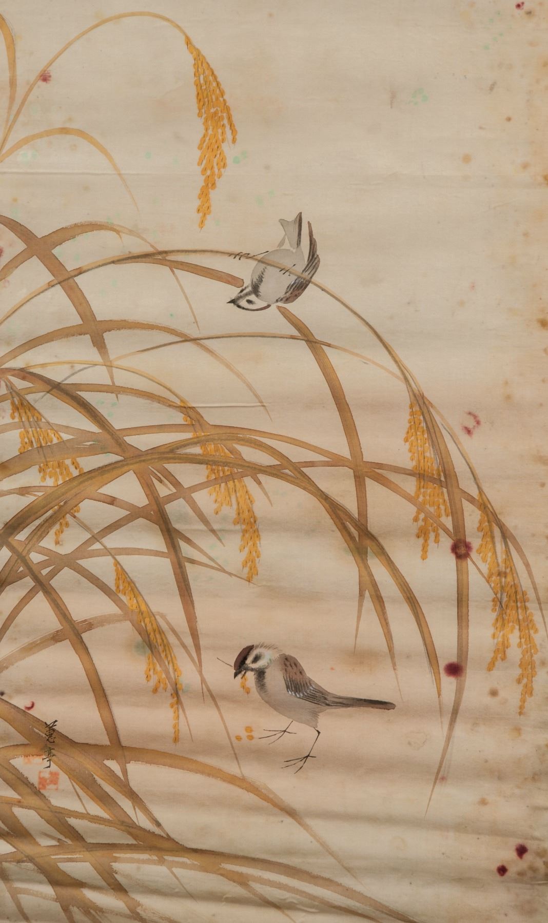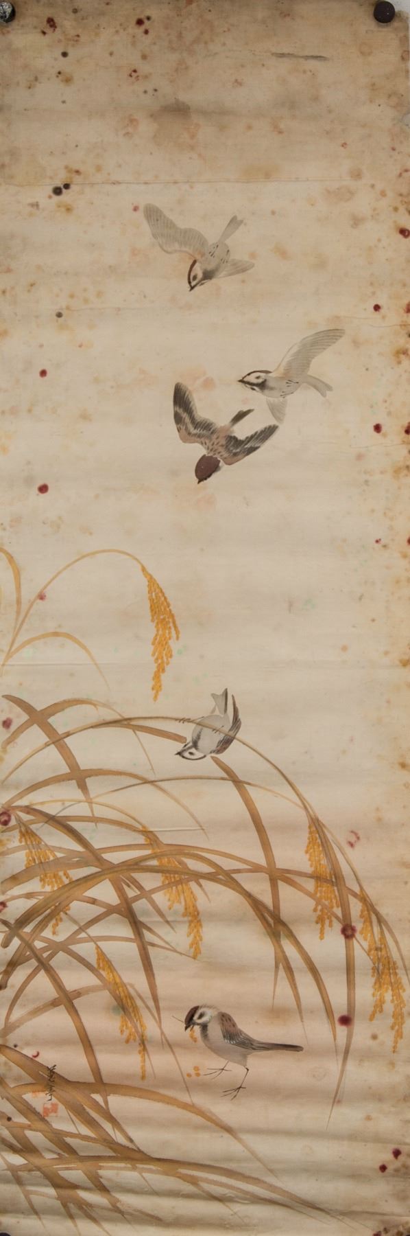 Painting of birds and wheat; Chinese ink on paper; signed Hui Ting; inscribed with 1 artist seal; 16th-18th century; 110 cm x 38 cm