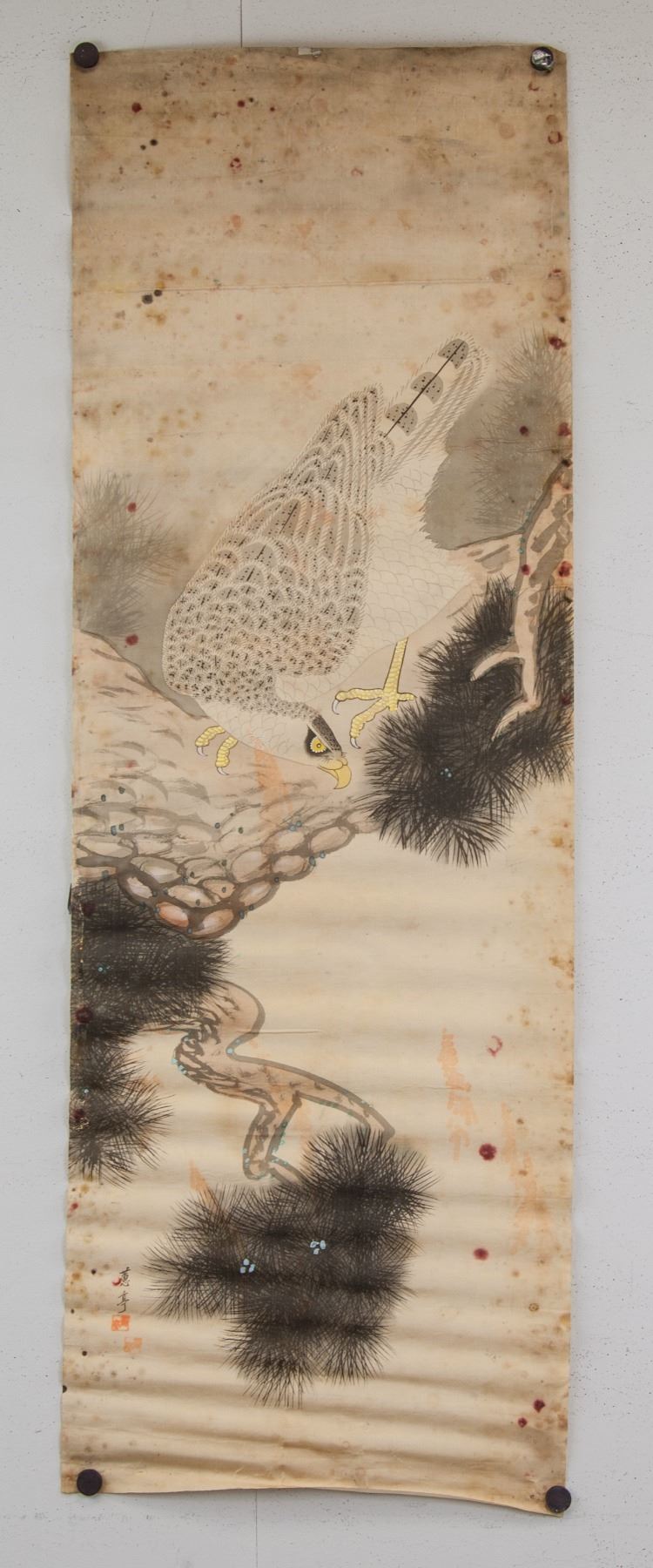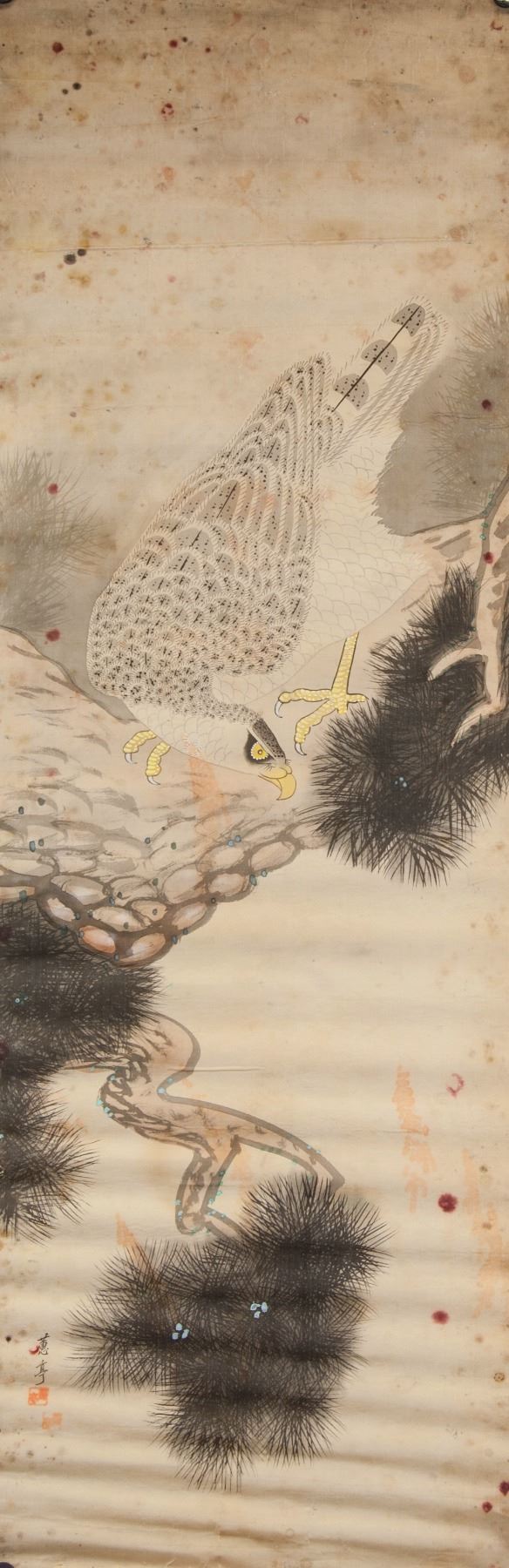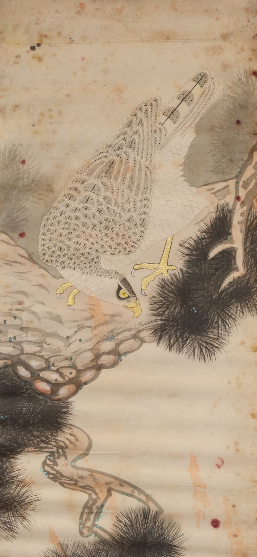 Painting of eagle and pine tree; Chinese ink and watercolour on paper; signed Hui Ting; inscribed with 2 artist seal; 16th-18th century; 108 cm x 35 cm